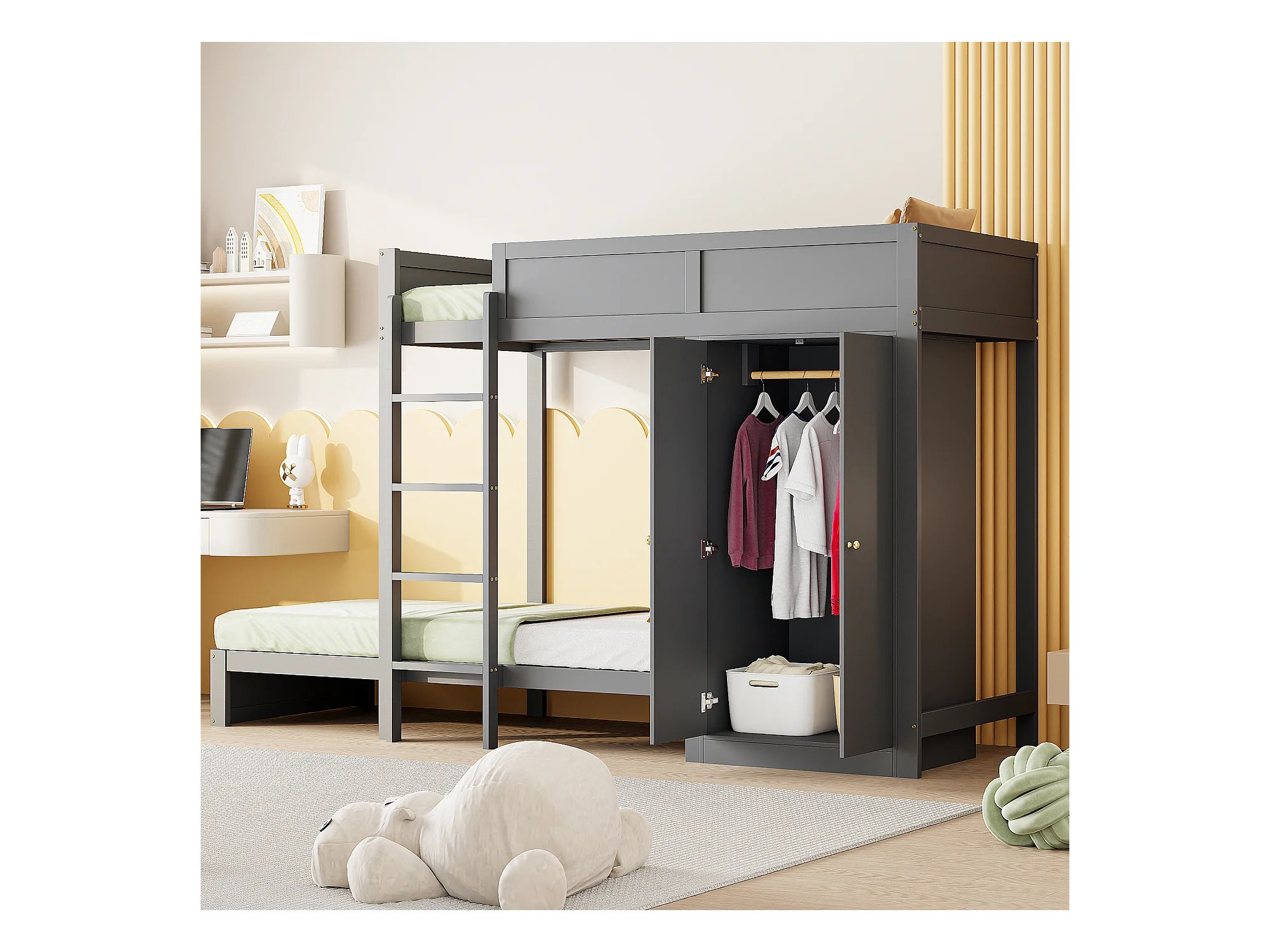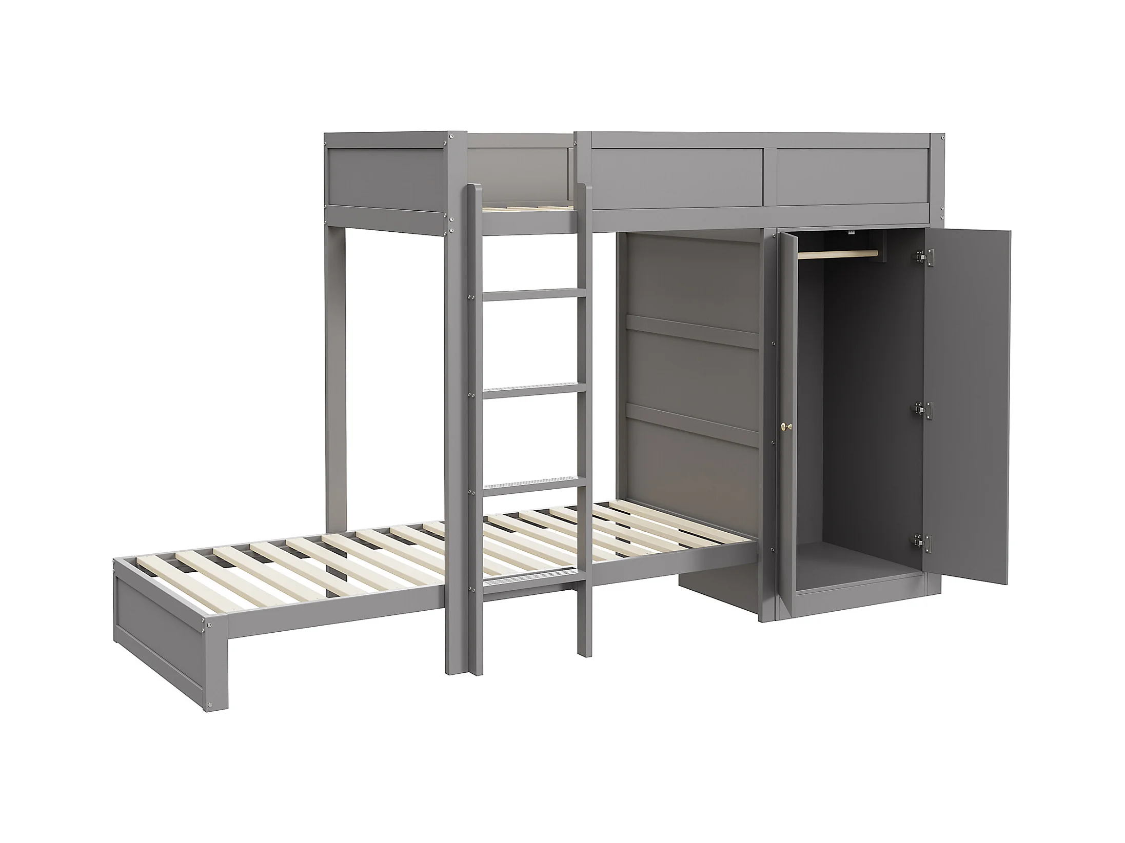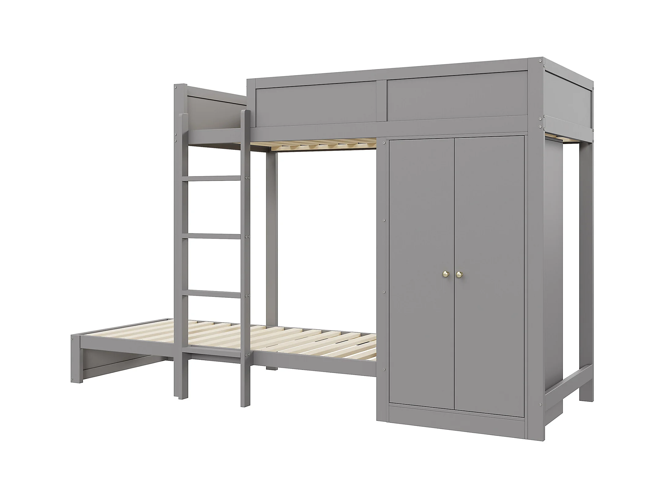 Lits superposés 2 x 90 x 200 cm avec armoire et échelle - pin + MDF - gris (sans matelas)