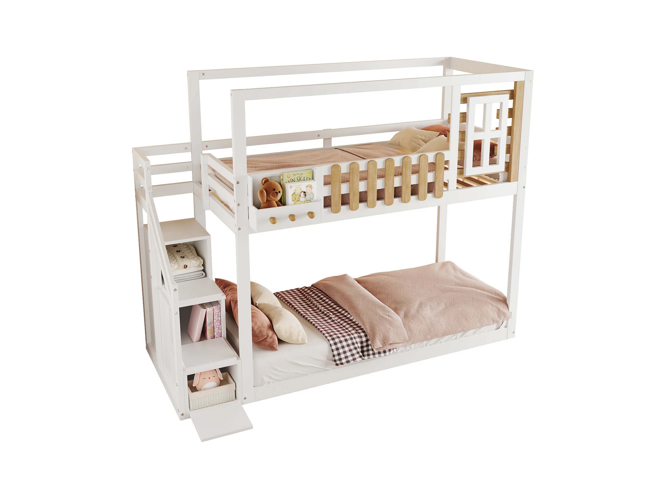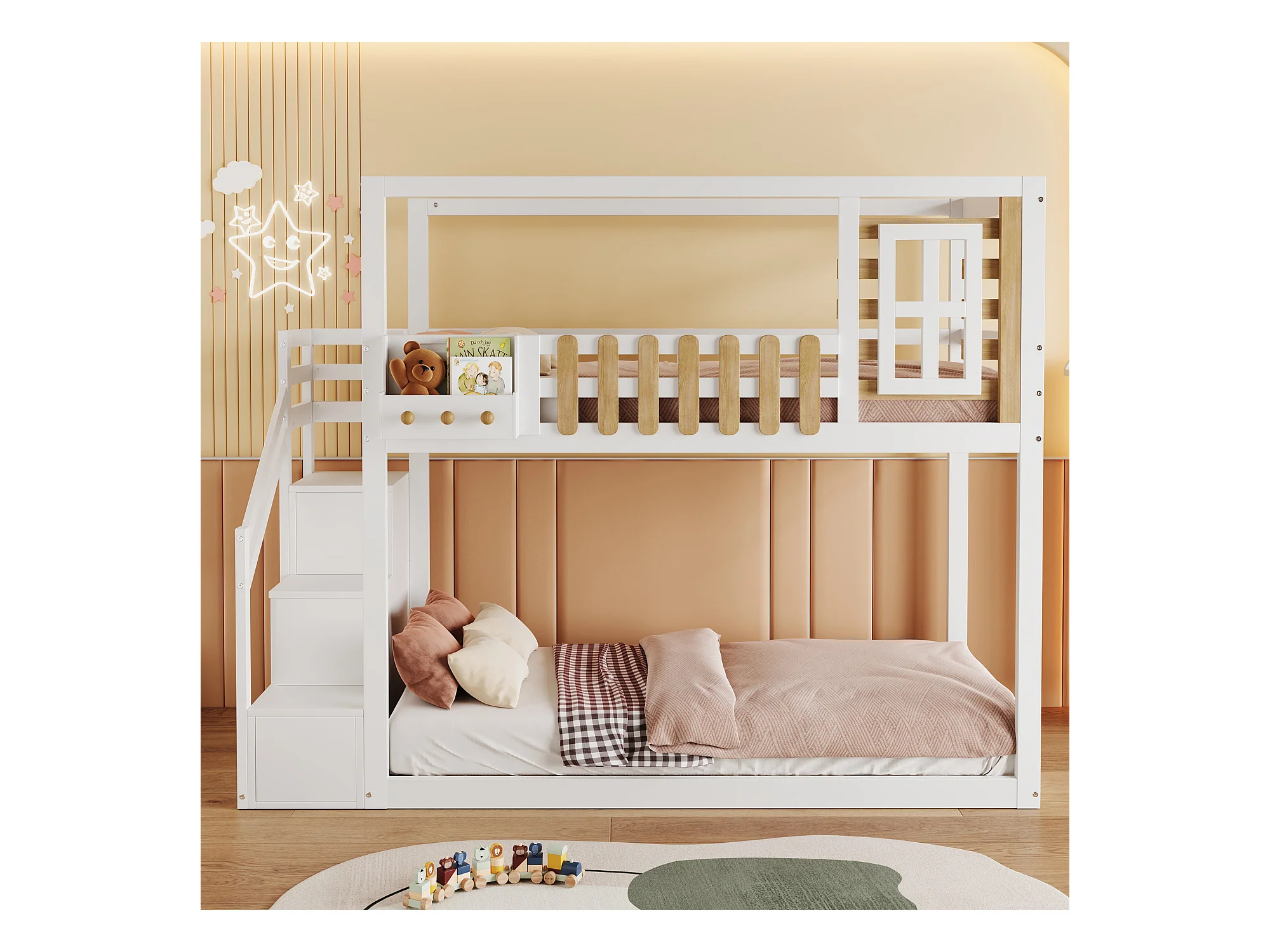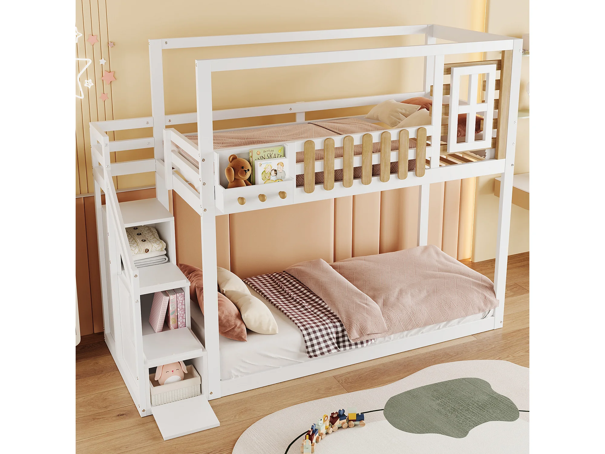 Lits superposés 2 x 90 x 200 cm avec escalier, fenêtre et 3 casiers - bois de pin + MDF - blanc (sans matelas)