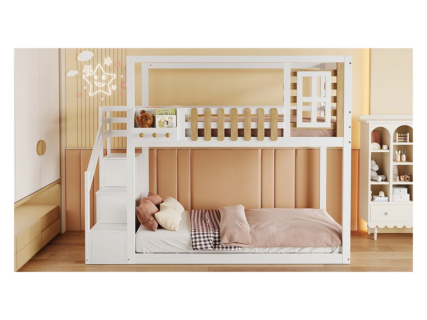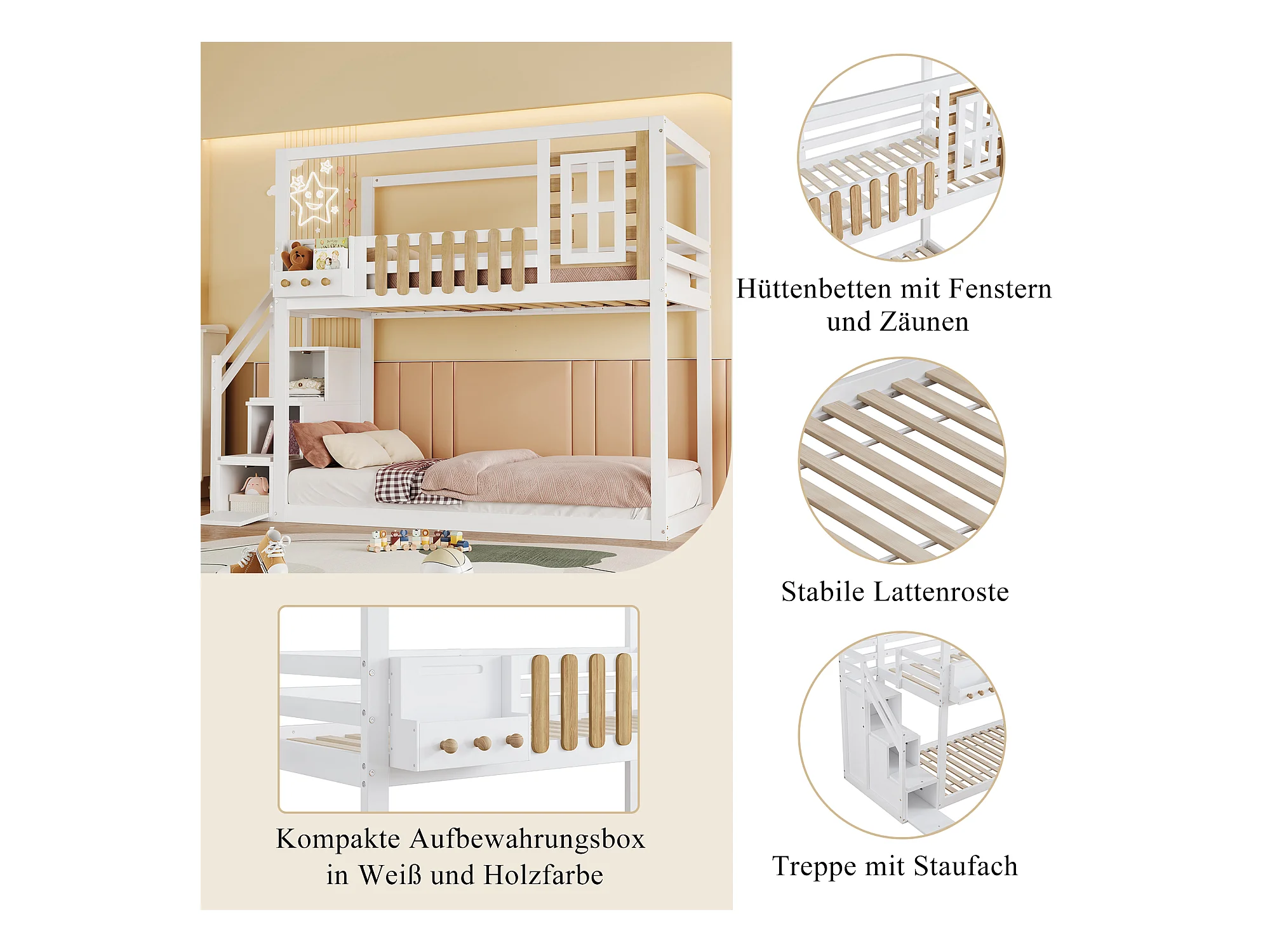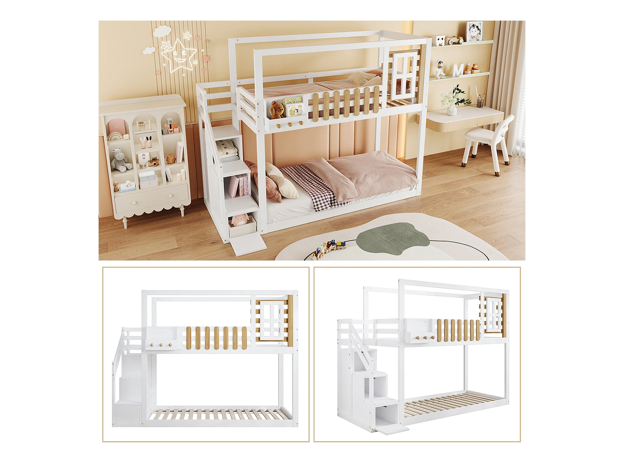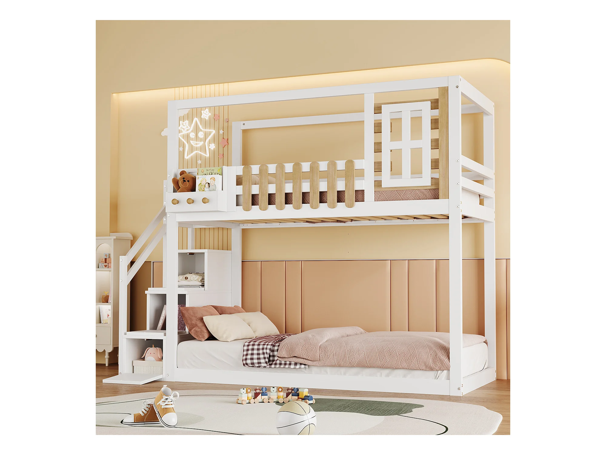Lits superposés 2 x 90 x 200 cm avec escalier, fenêtre et 3 casiers - bois de pin + MDF - blanc (sans matelas)