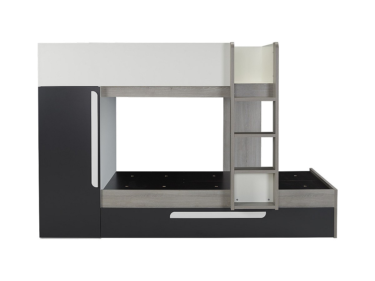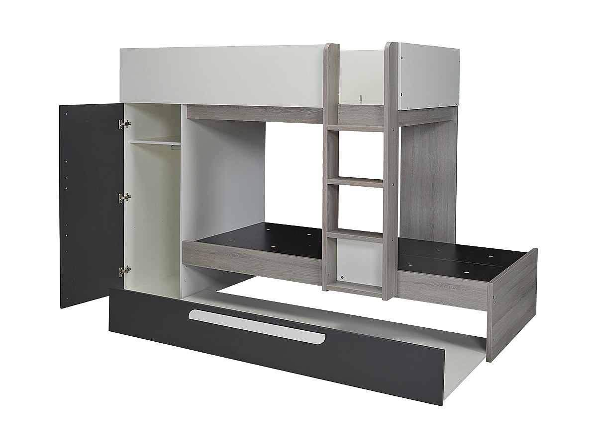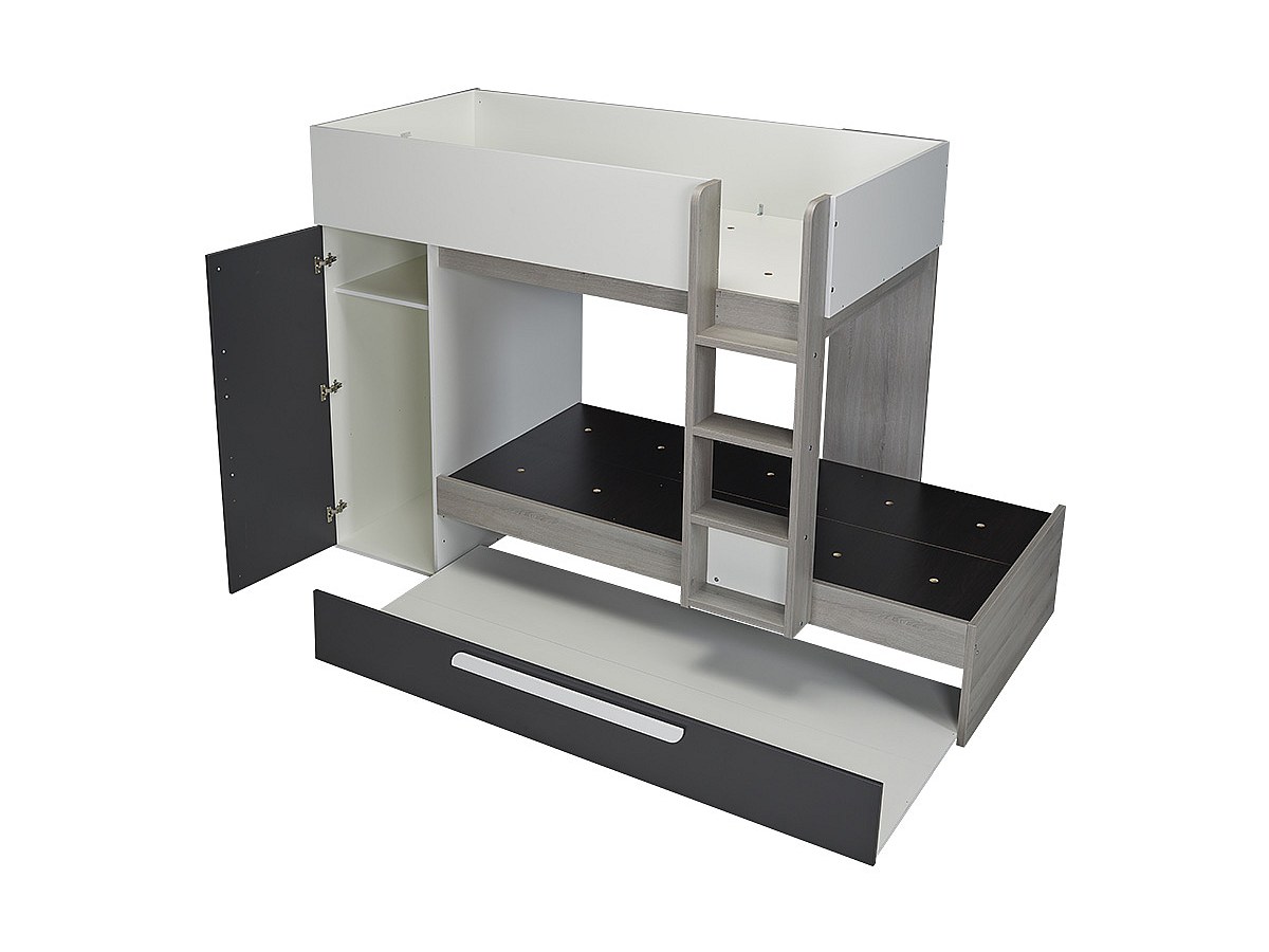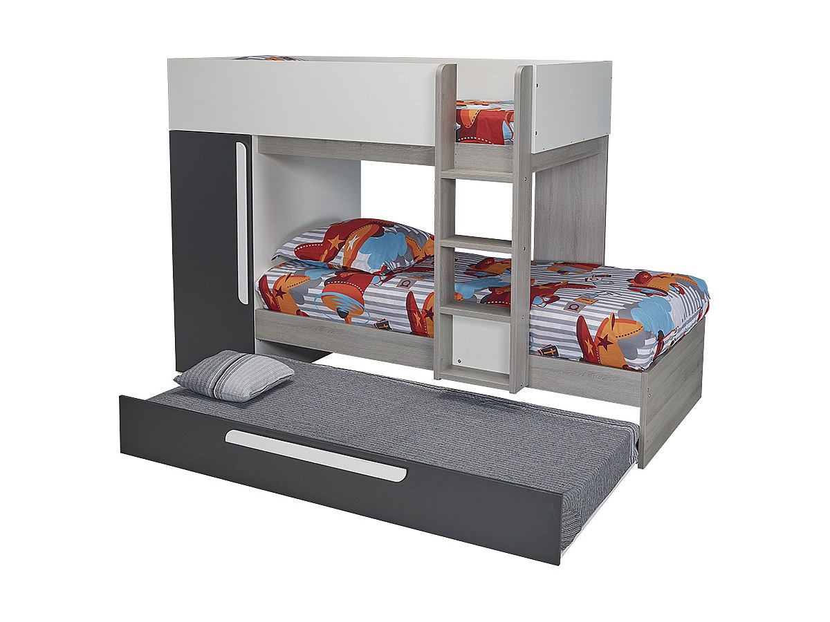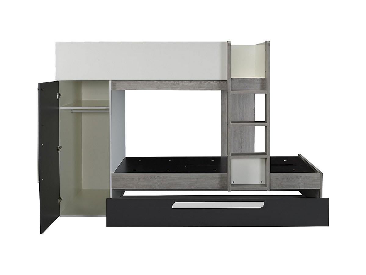 Lits superposés avec tiroir lit gigogne ANTONIO - 3 x 90 x 190 cm - Armoire intégrée - Pin anthracite et blanc