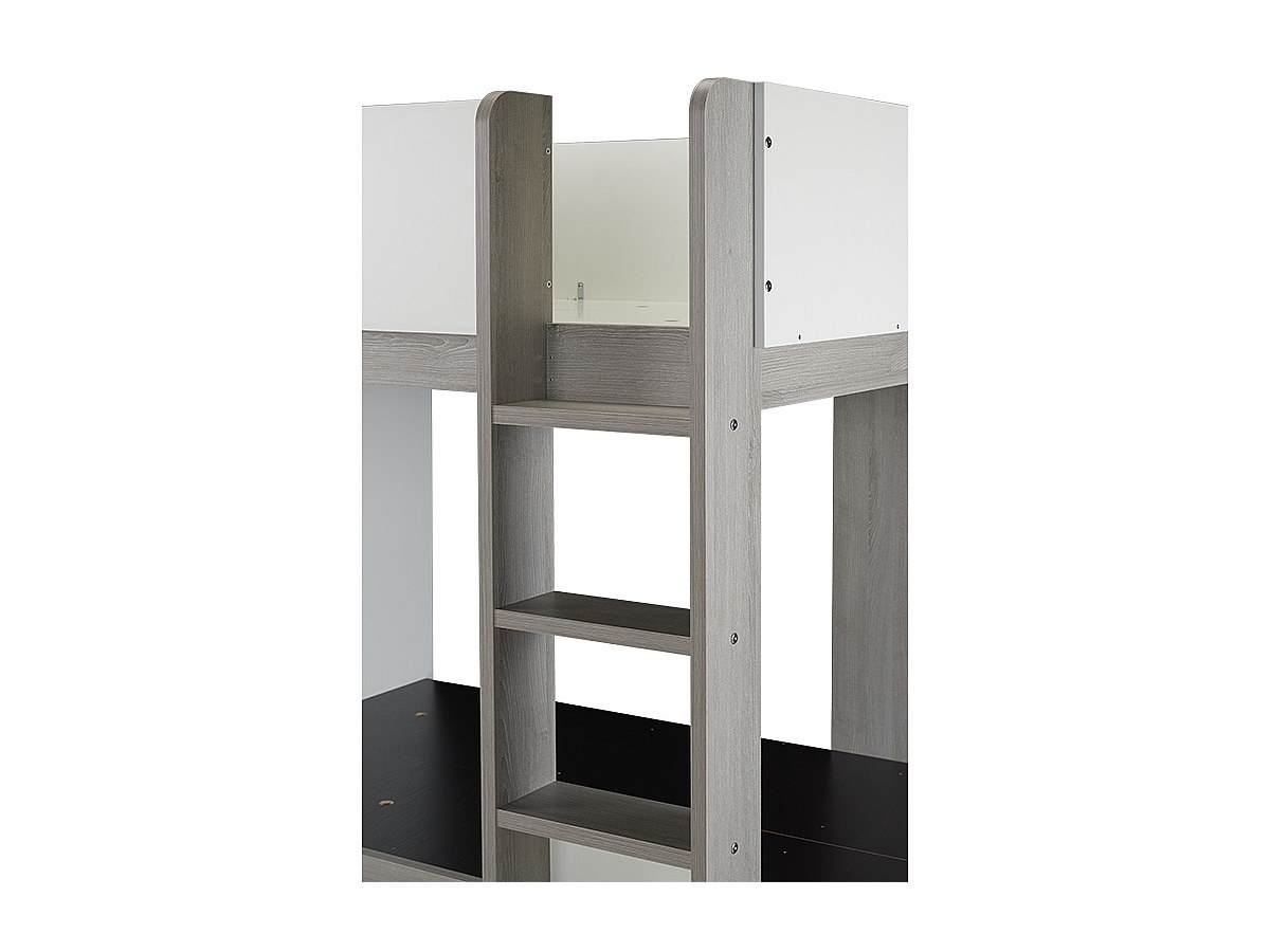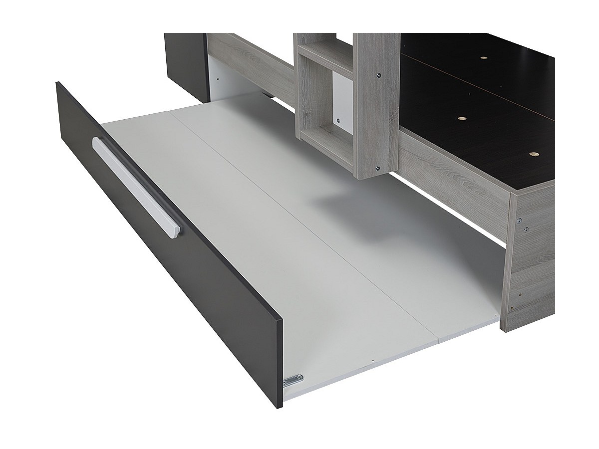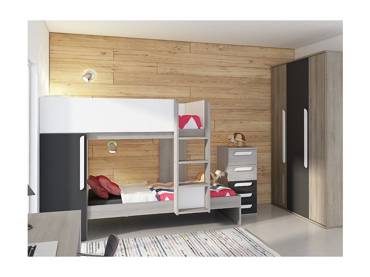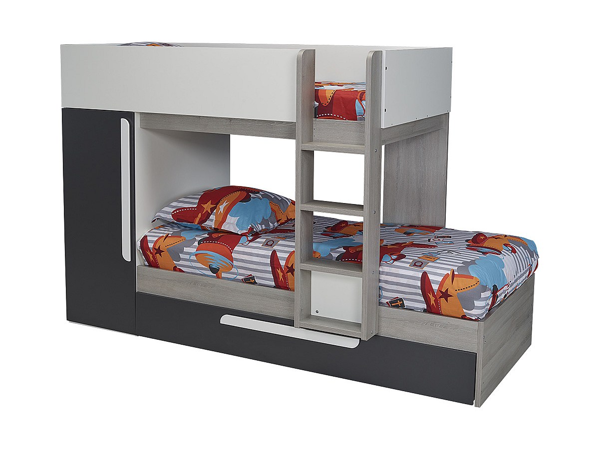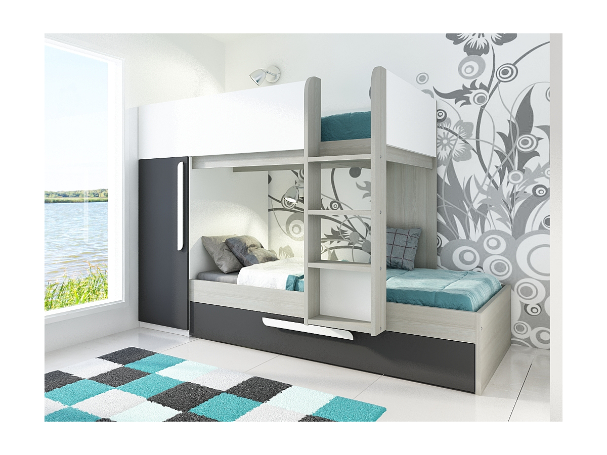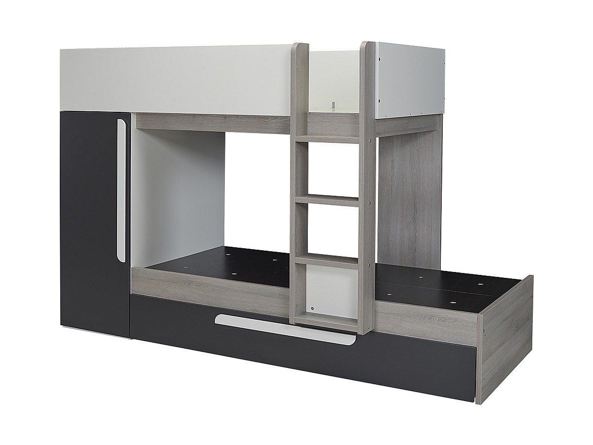 Lits superposés avec tiroir lit gigogne ANTONIO - 3 x 90 x 190 cm - Armoire intégrée - Pin anthracite et blanc