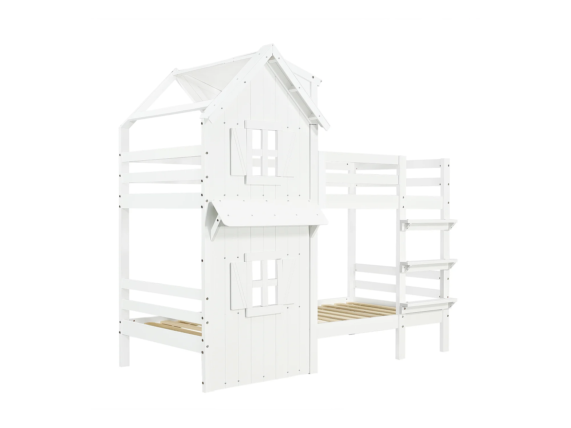 Lit superposé cabane 90x200cm - en bois massif - avec 2 fenêtres - Blanc