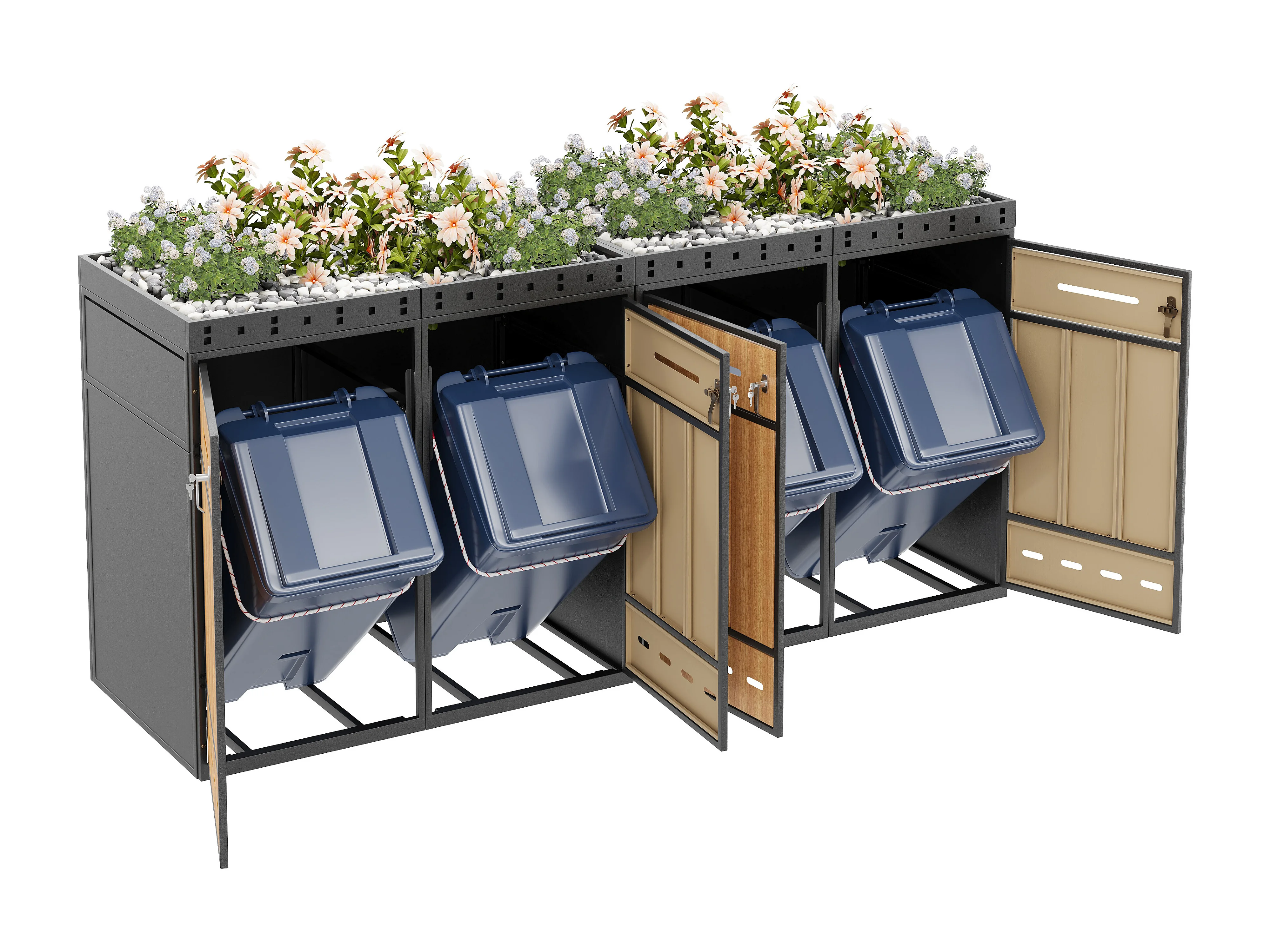 Local à poubelles avec toit végétalisé - 2 x 132 x 80 x 124 cm - capacité 120-240 litres - avec 4 portes - métal - gris + naturel