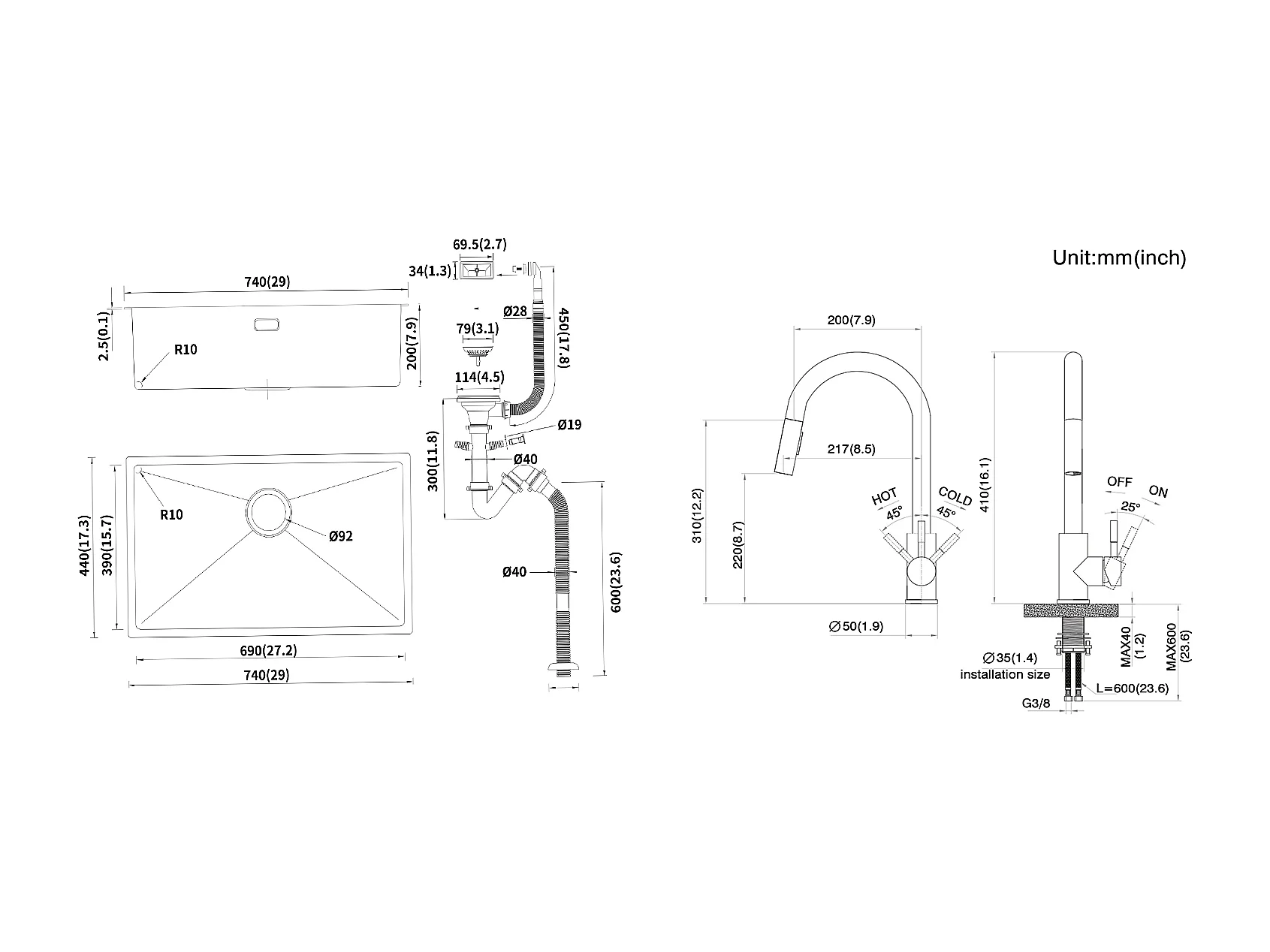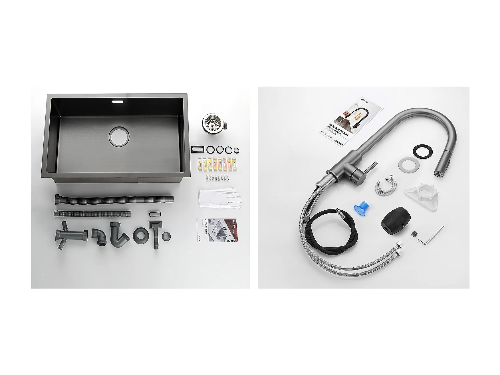 Lonheo Max Évier Cuisine 1 Bac 74*44*20CM,en Inox Brossé avec Siphon et Trop-Plein+Robinet Cuisine Douchette Extractible Gris Foncé Rotatif 360 °