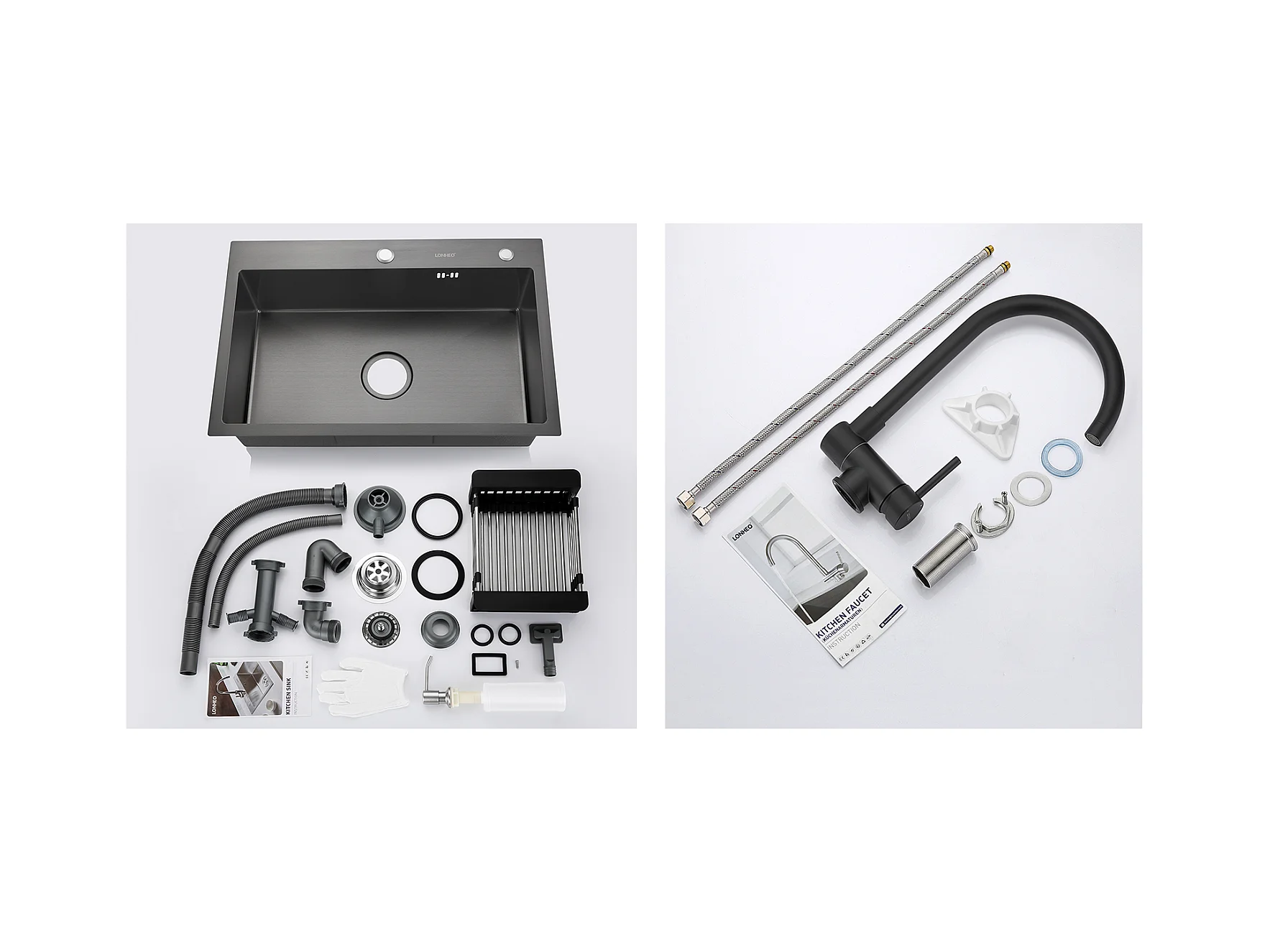 Évier Cuisine Noir 68x45x19CM avec Distrubuteur de savon et Égouttoir panier+Robinet Cuisine Pivotant à 360° avec Eau Chaude/Froide, Chromé