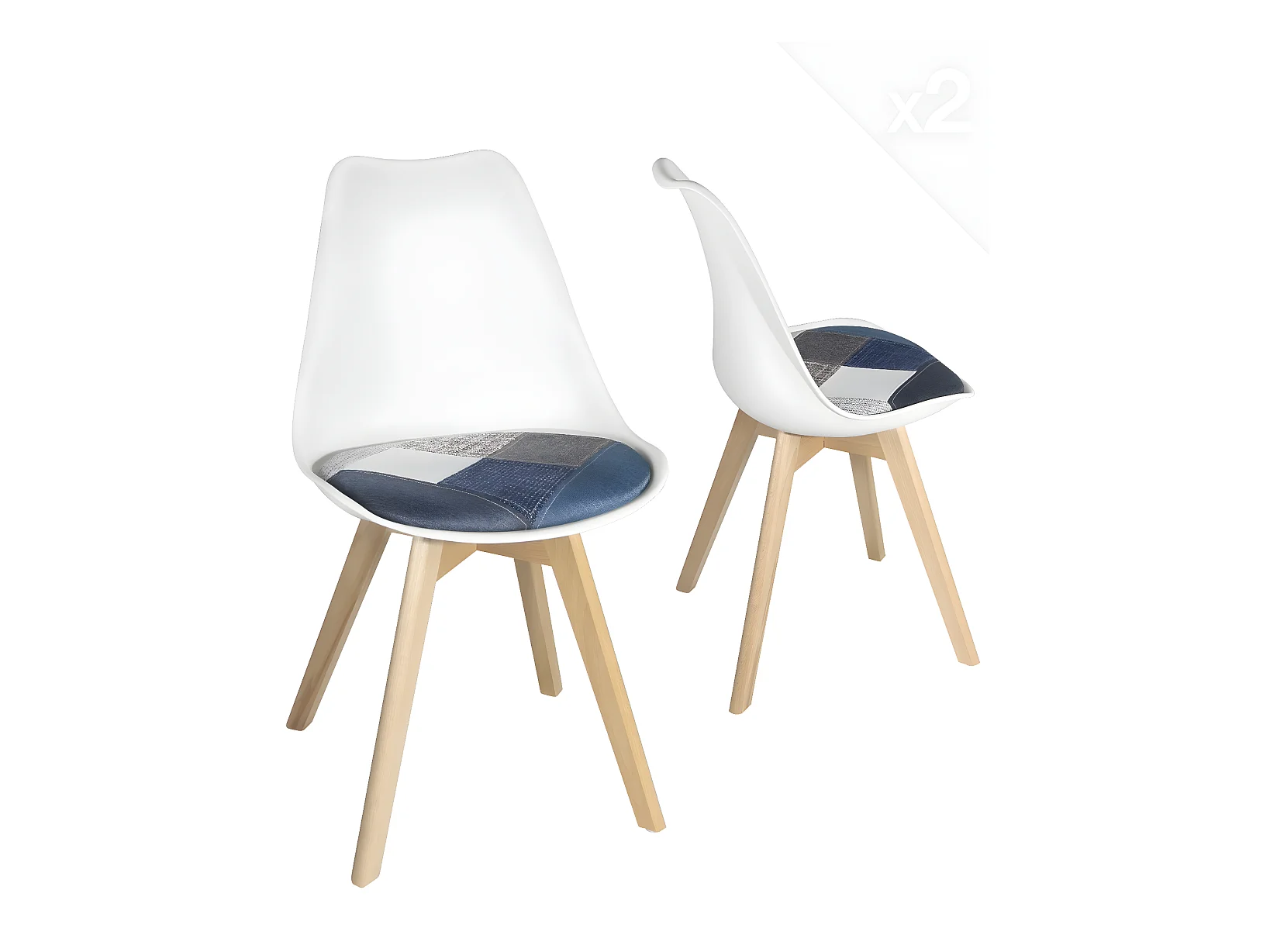 Lot 2 chaises scandinaves coussin tissu patchwork rembourré pieds bois LAO (Bleu)