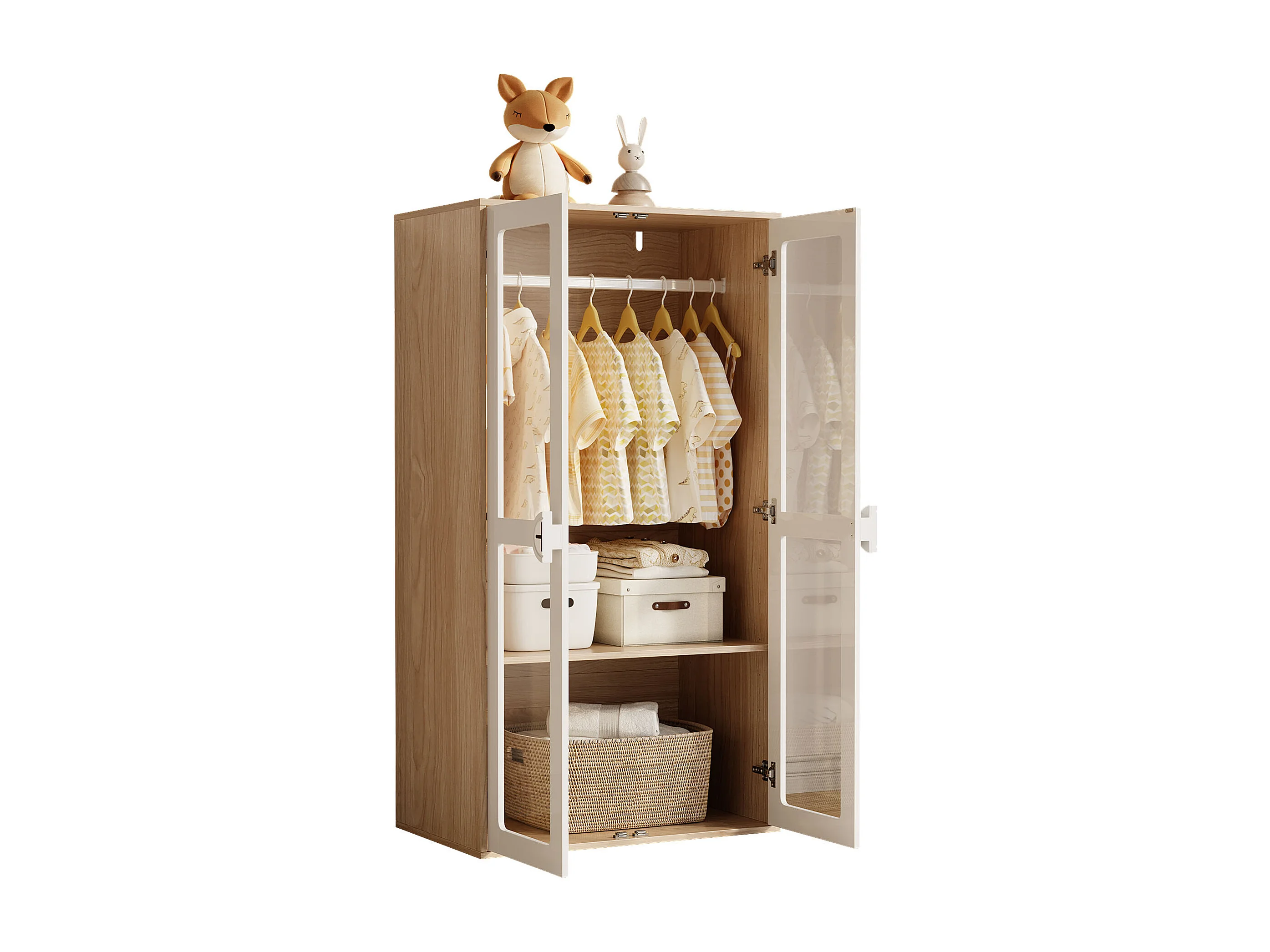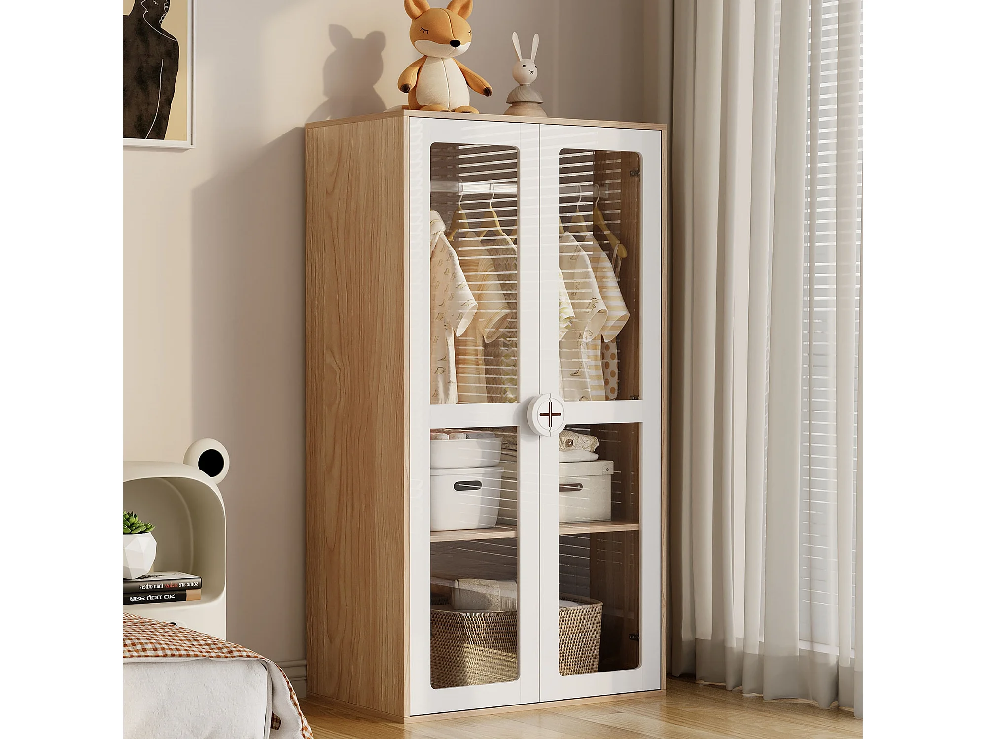 Lot de 2 armoires enfant, 2 portes vitrées et portant à vêtements, panneaux de particules , blanc + naturel.