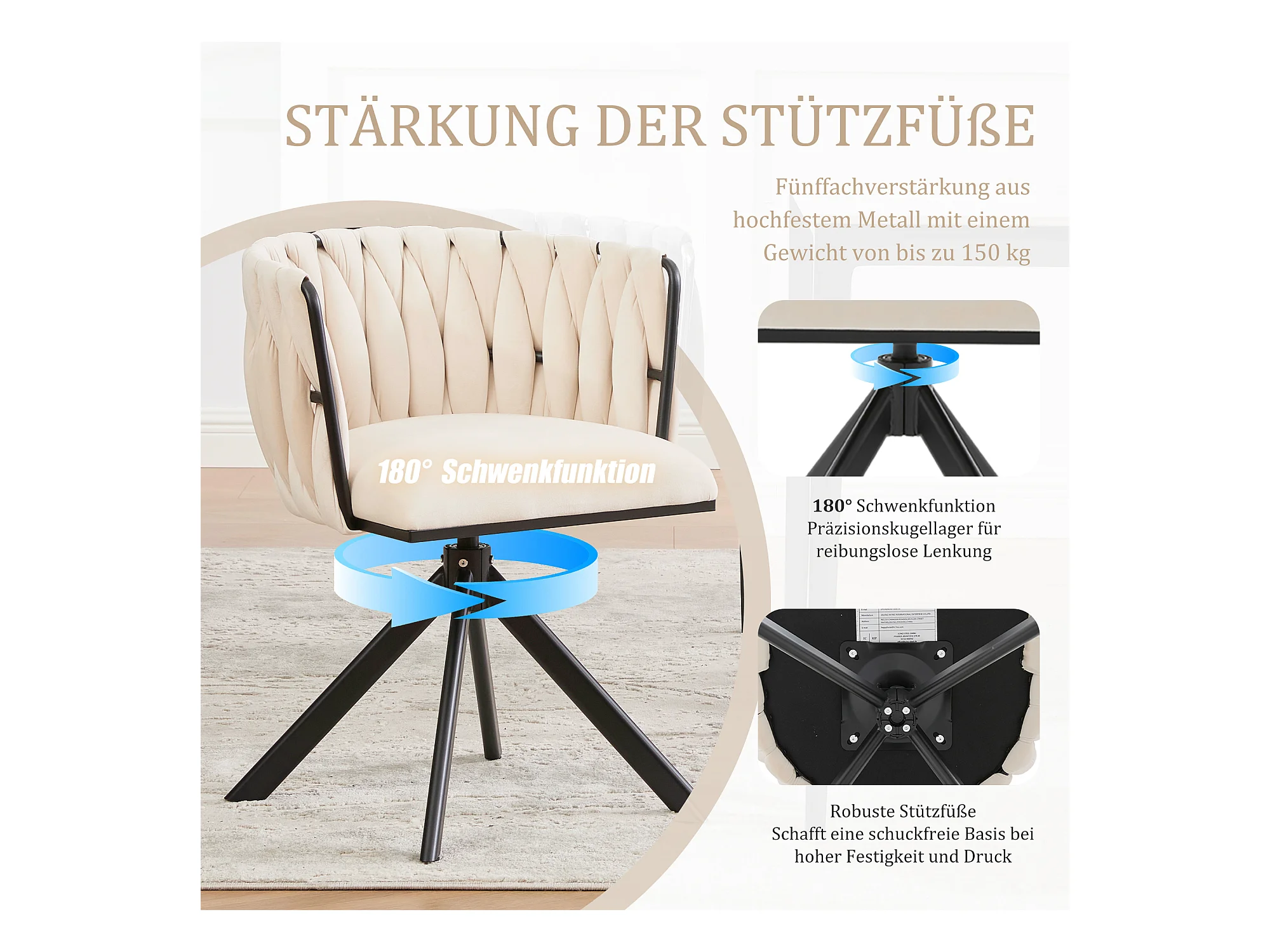 Lot de 2 chaises de salle à manger en velours ivoire avec fonction pivotante et pieds en métal noir