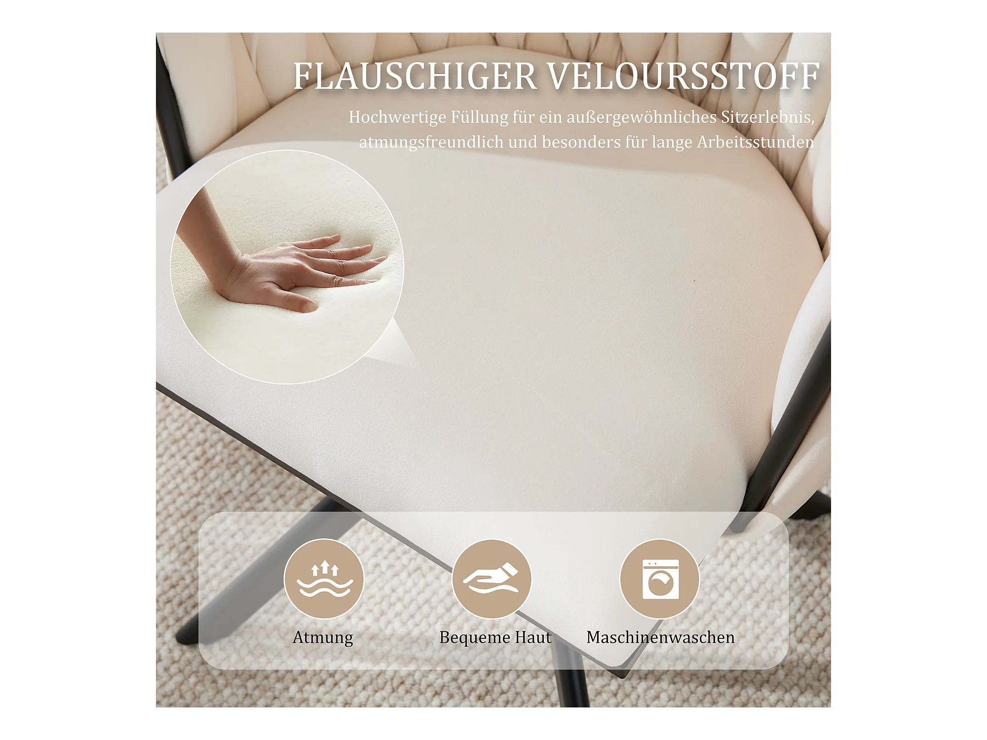 Lot de 2 chaises de cuisine, tissu en velours, pieds en bois brun, beige blanc