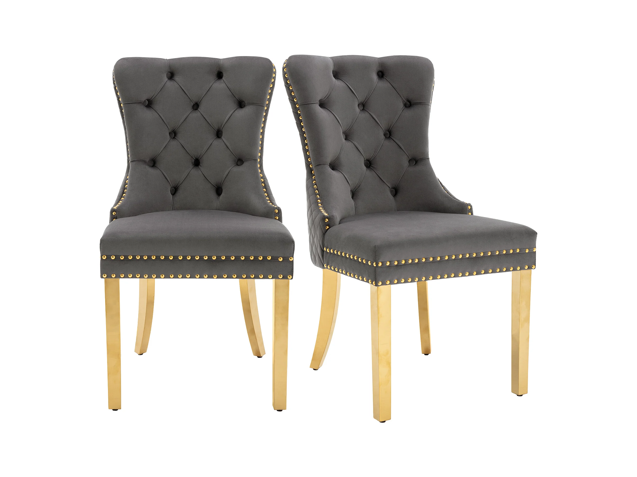 Lot de 2 chaises en velours gris avec pieds en bois gris, boutons décoratifs et rivets argentés