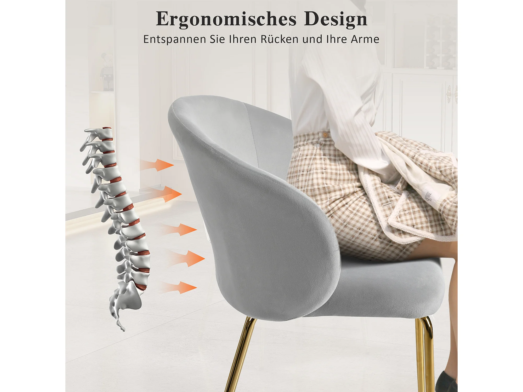 Lot de 2 chaises de salle à manger élégantes avec revêtement en velours, accoudoirs, pieds en métal doré, gris
