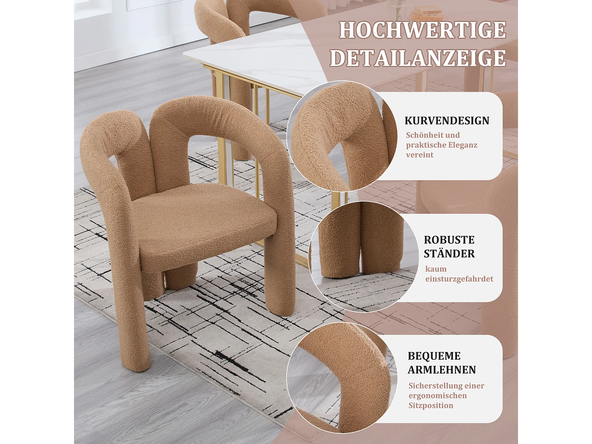 Lot de 2 chaises de salle à manger — en teddy camel — accoudoirs design à deux arcs - élégant et confortable