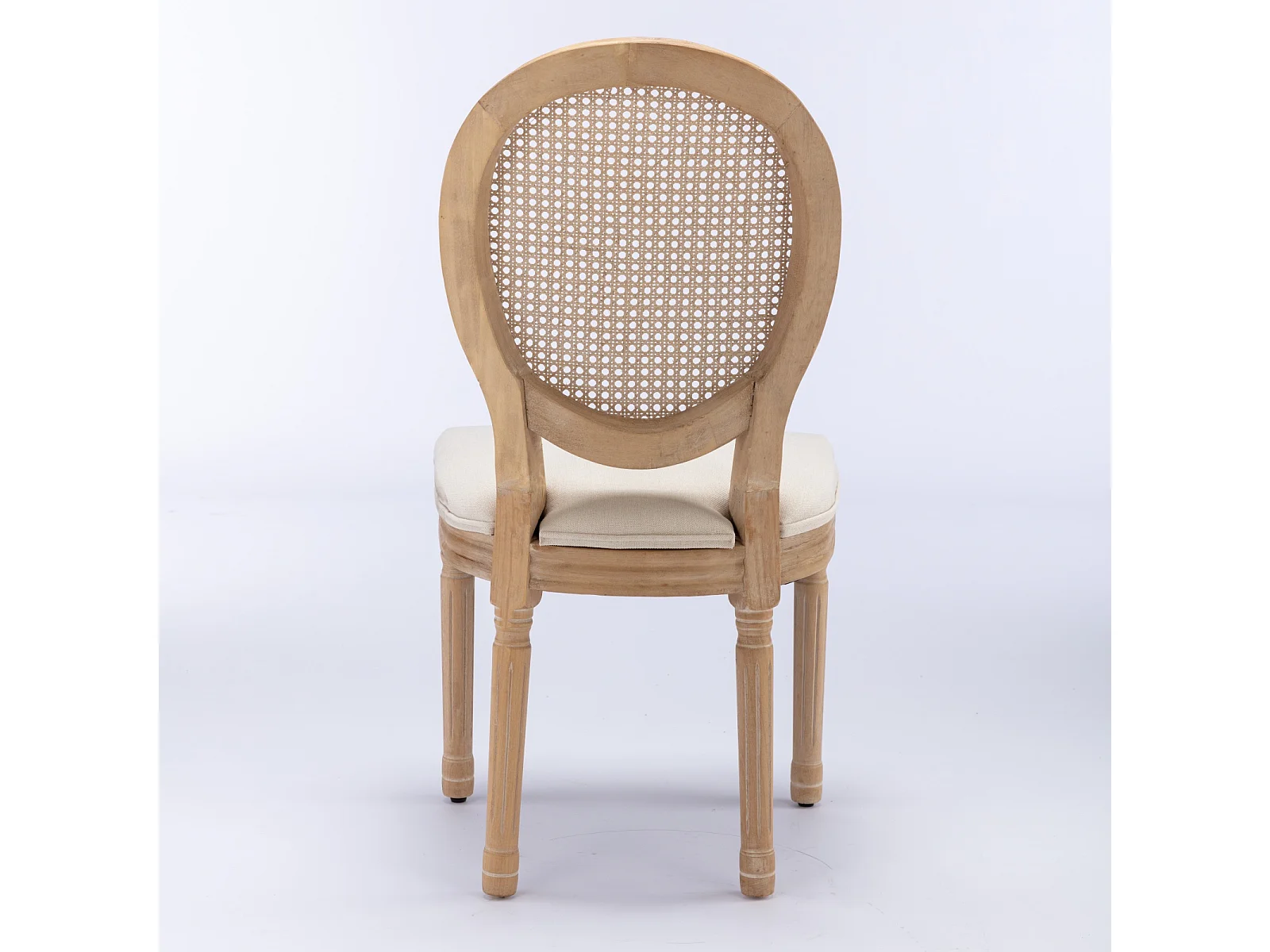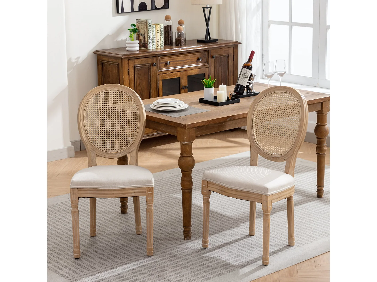Lot de 2 chaises en bois et tissu lin - Dossier en rotin - Beige et naturel clair
