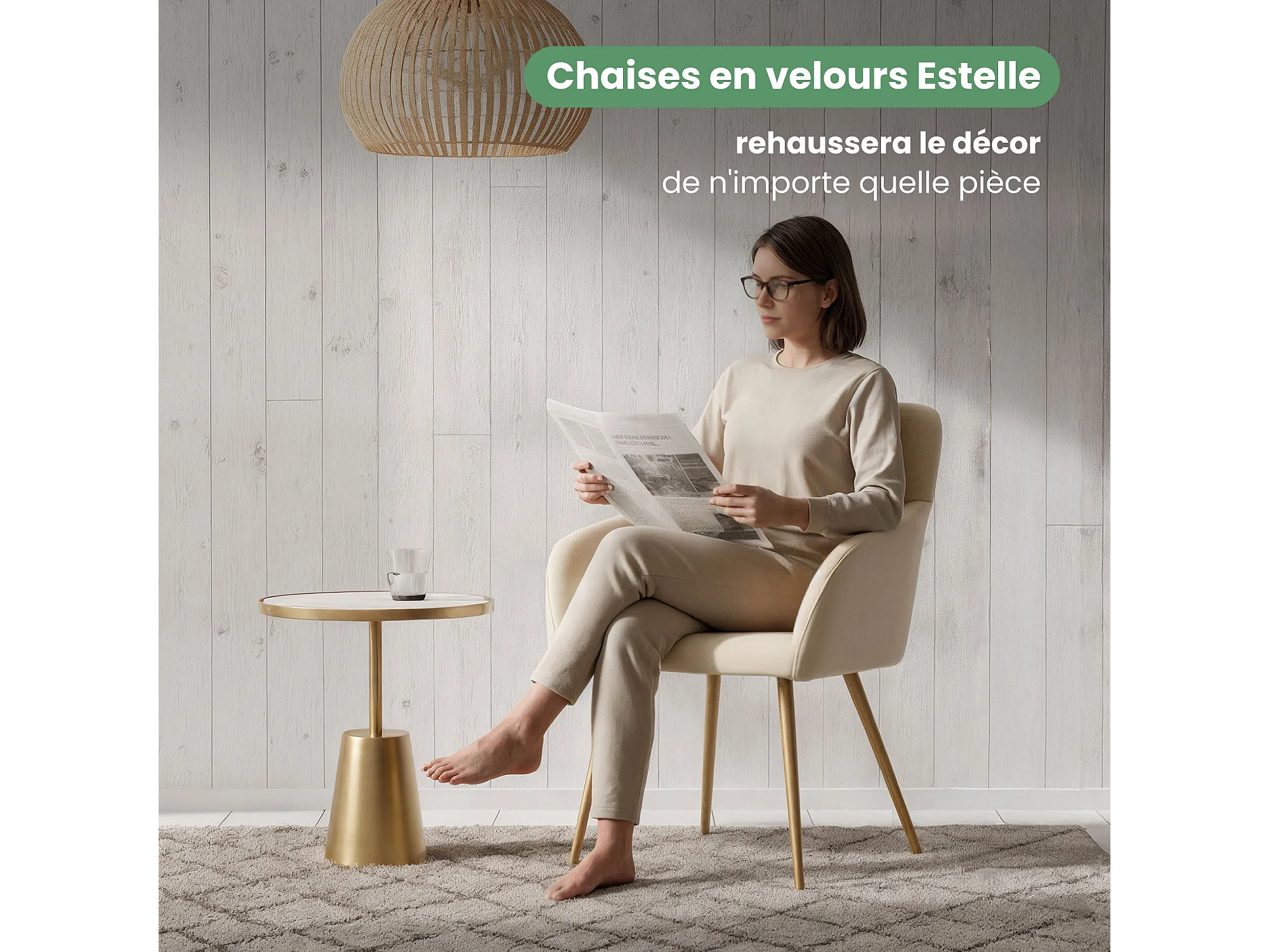 Lot de 2 Chaises en velours lisses ESTELLE Beige pieds dorés