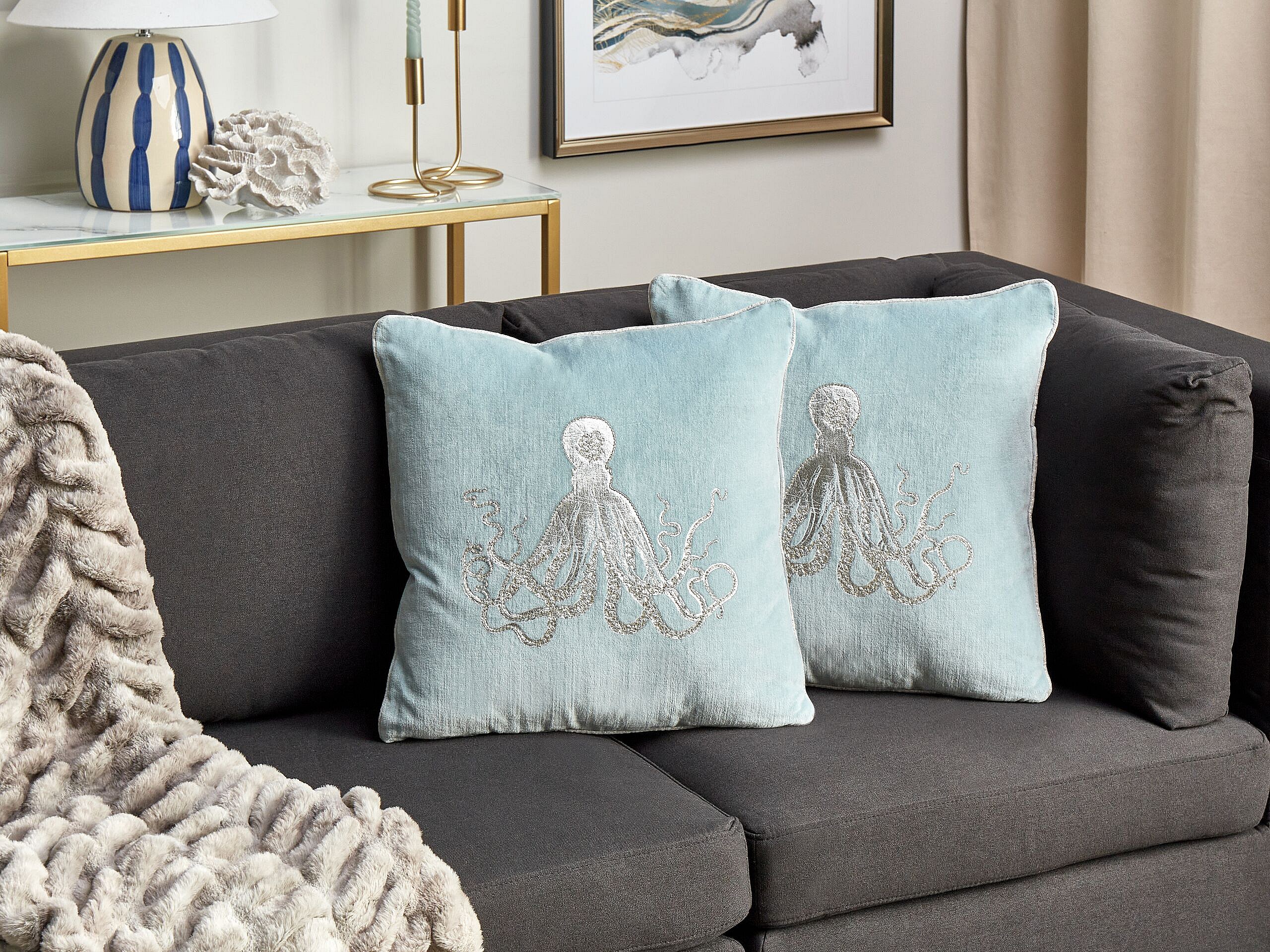 Lot de 2 coussins décoratifs LAMINARIA Velours 45 x 45 cm Bleu clair Motif animal