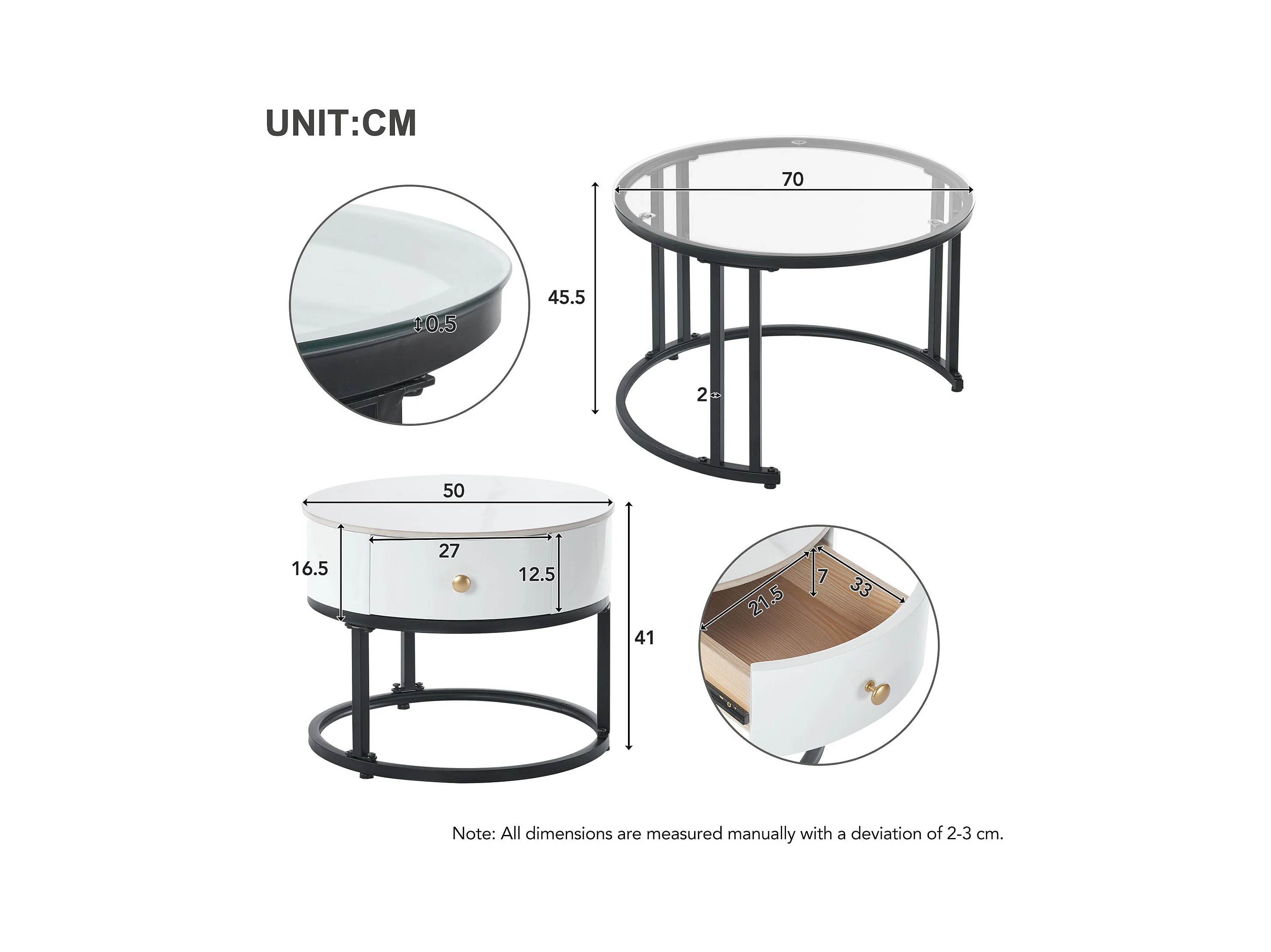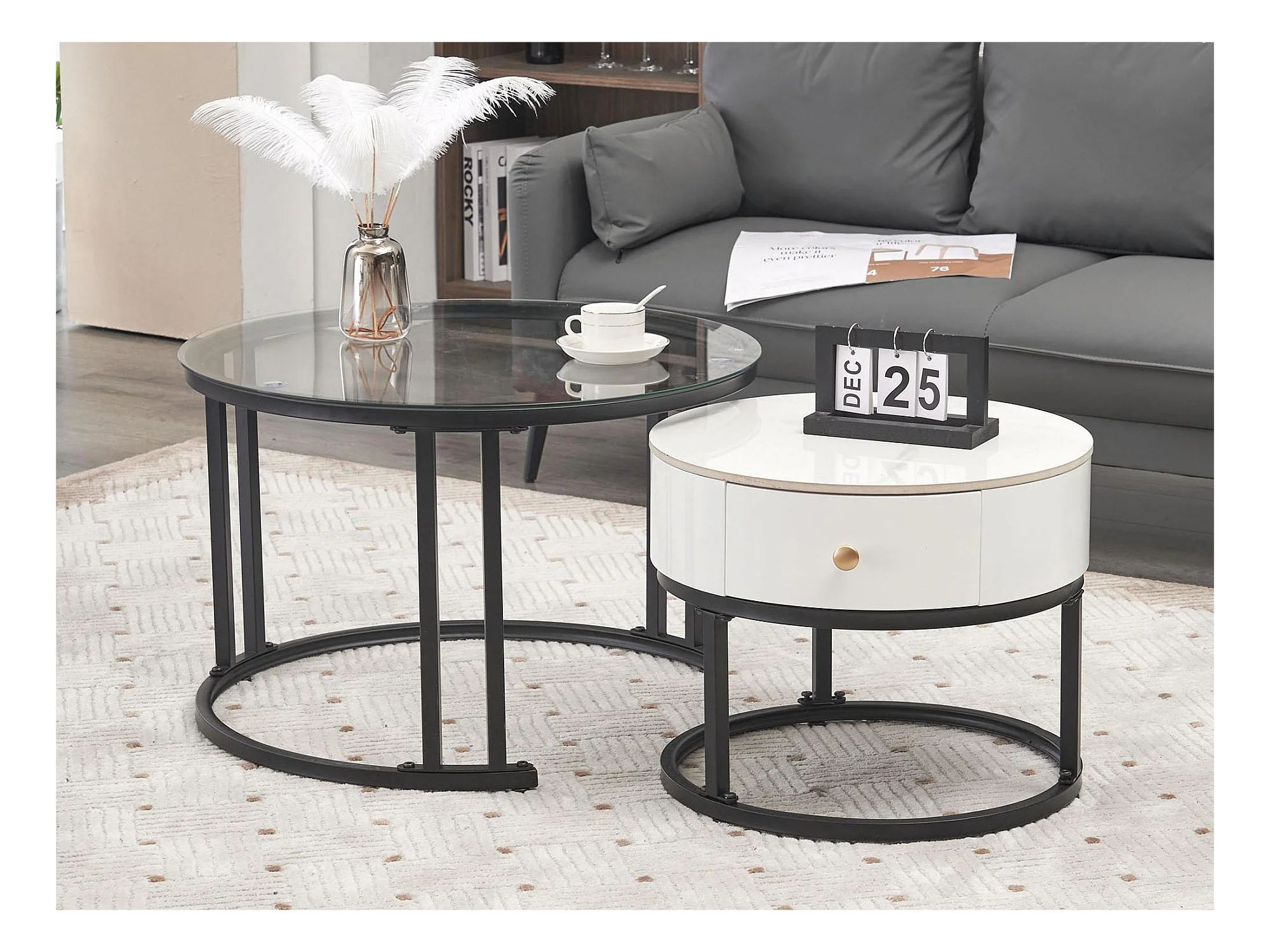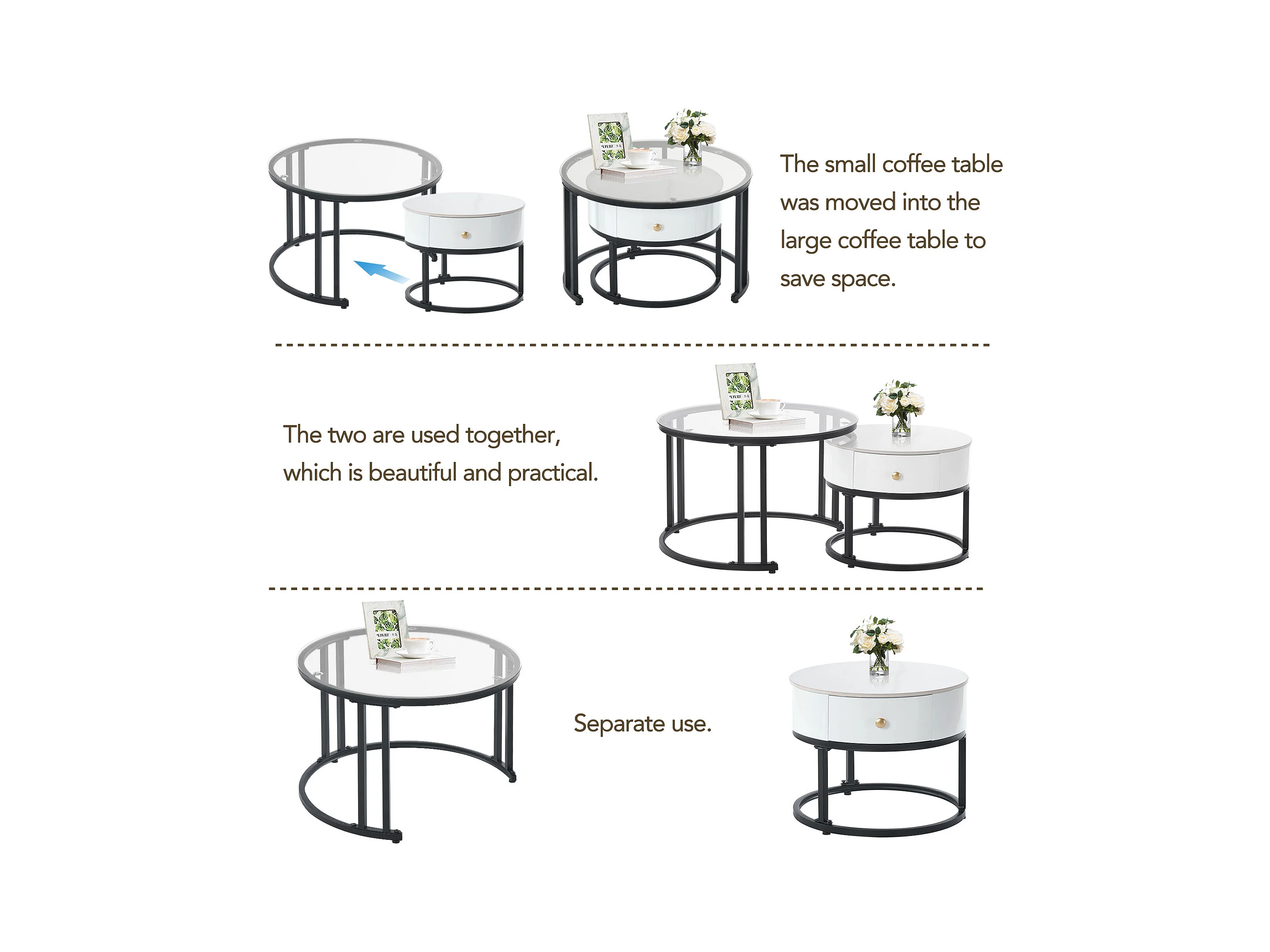 Lot de 2 Tables Basse Gigognes avec Tiroir - Plateaux Verre et Motif Marbre - Table d'Appoint - Blanc
