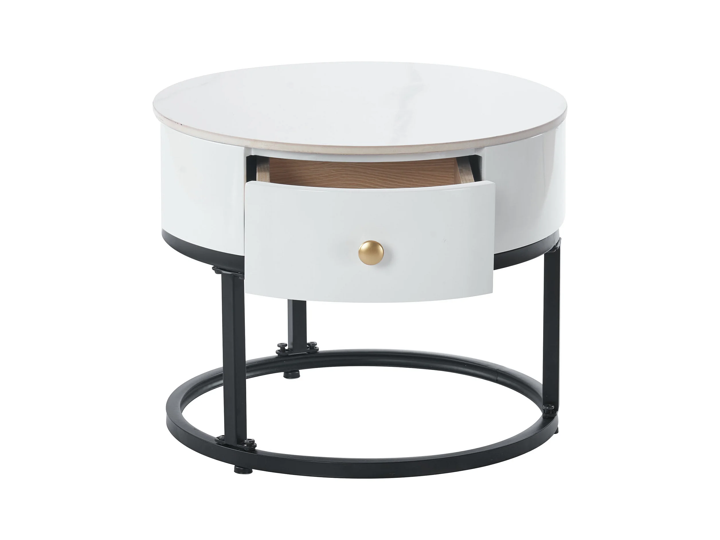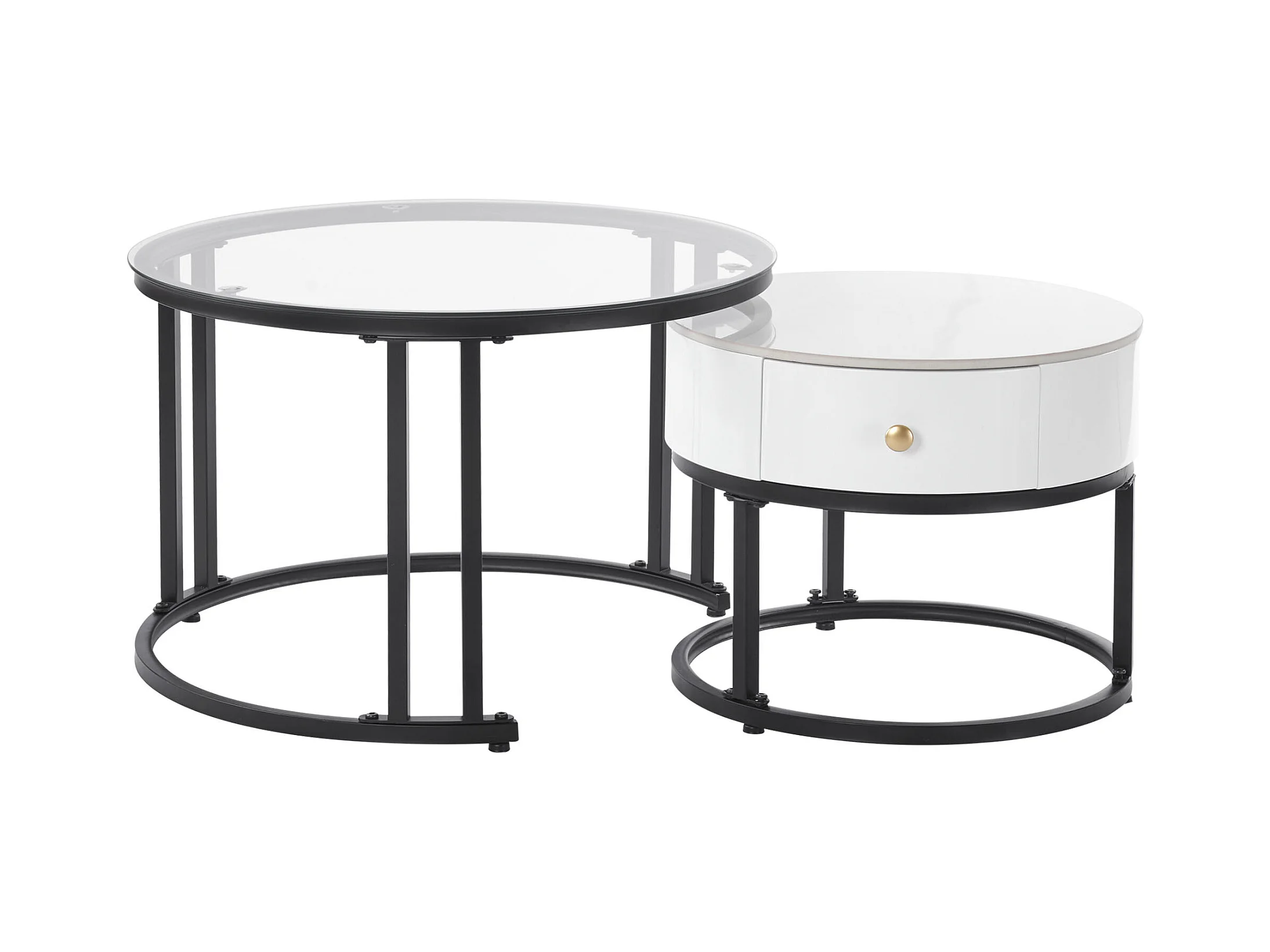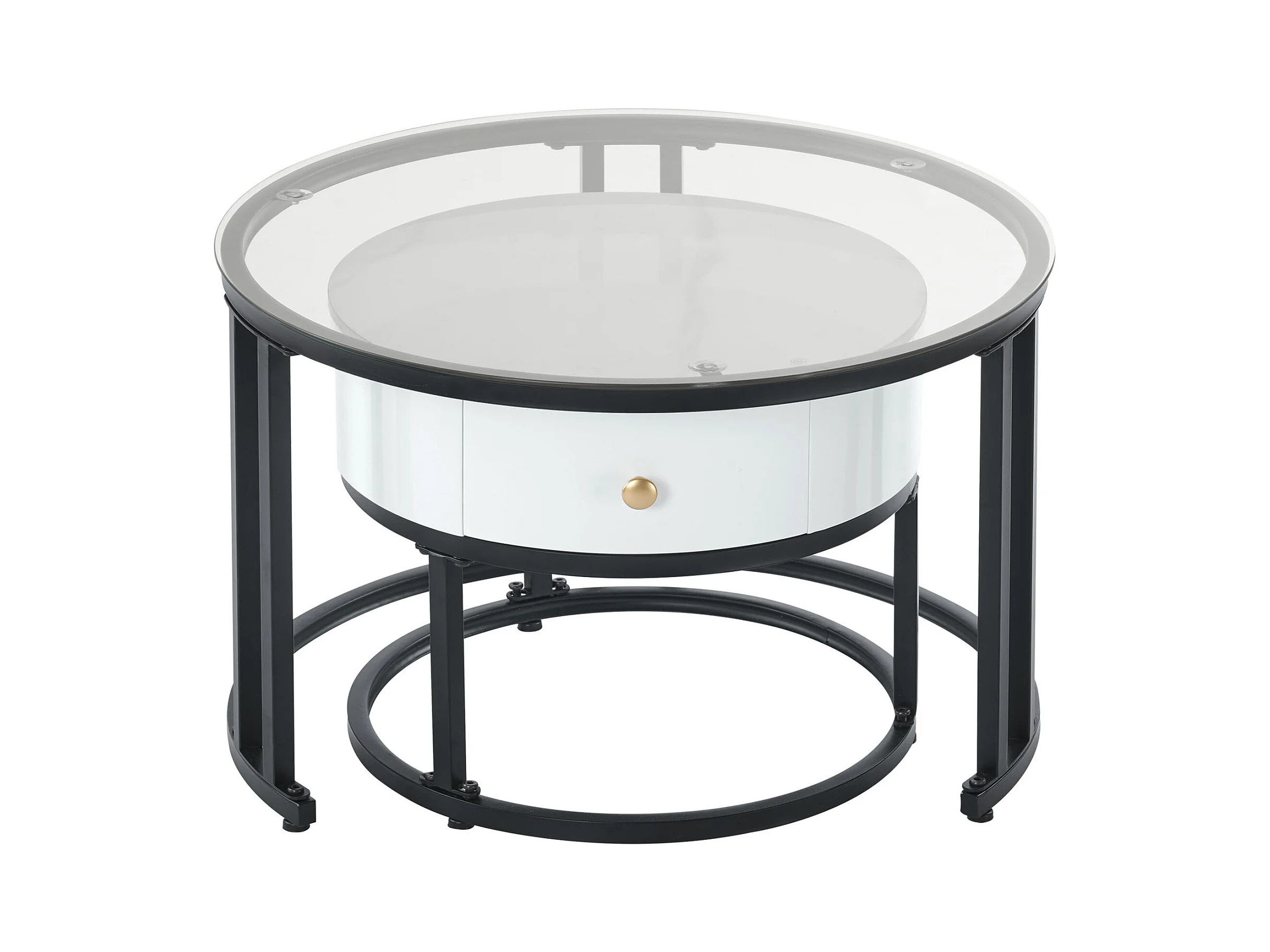 Lot de 2 Tables Basse Gigognes avec Tiroir - Plateaux Verre et Motif Marbre - Table d'Appoint - Blanc