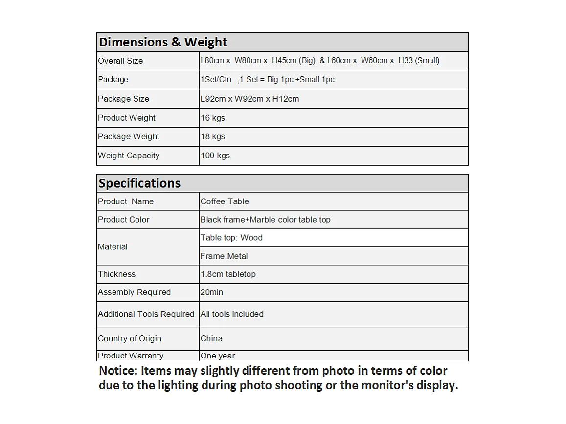 Lot de 2 Tables Basses gigognes, avec marbré brillant, Noir et Blanc
