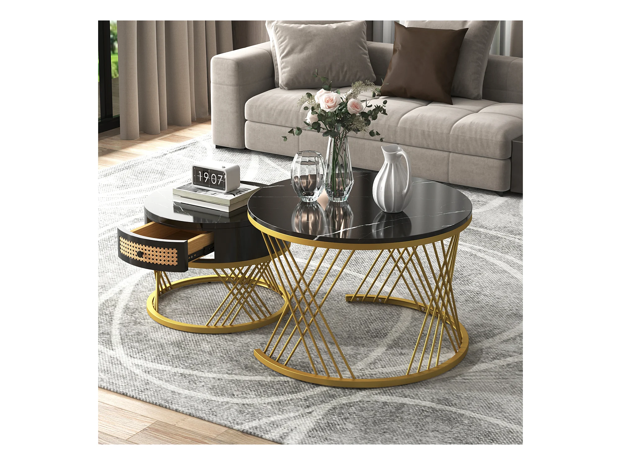 Lot de 2 tables basses - Table basse ronde avec tiroir en rotin - Plateau sticker aspect marbre noir - Pieds dorés