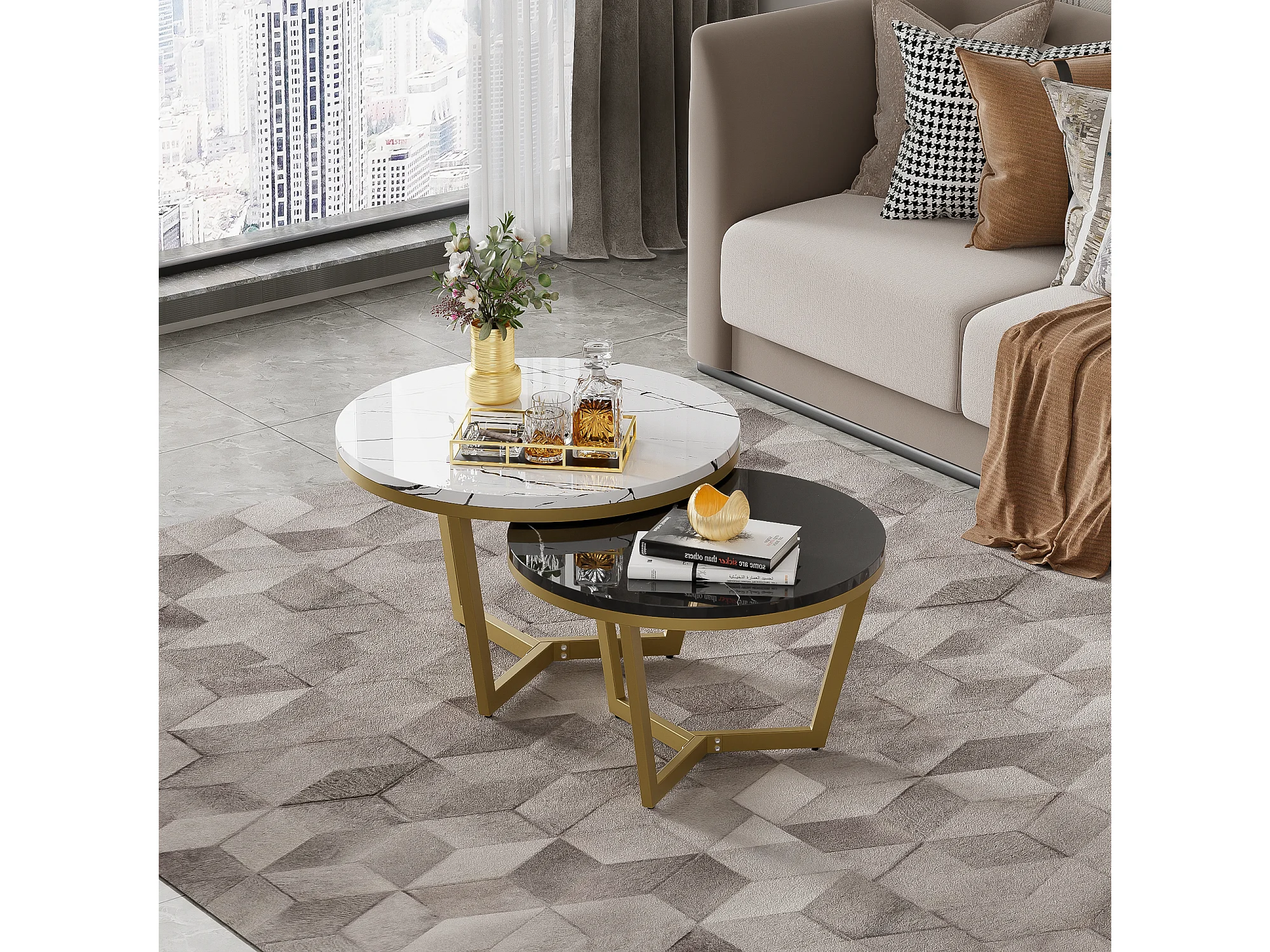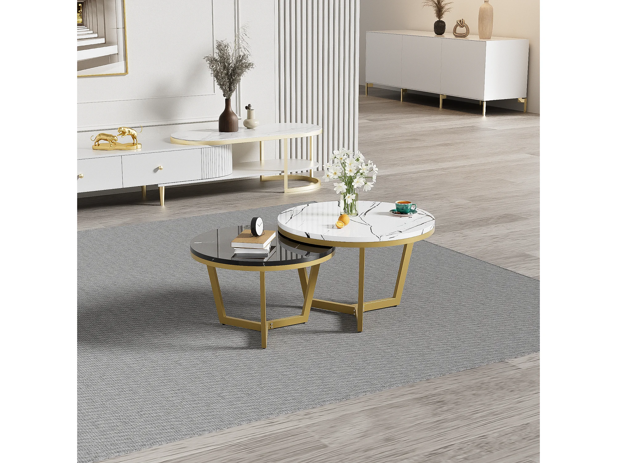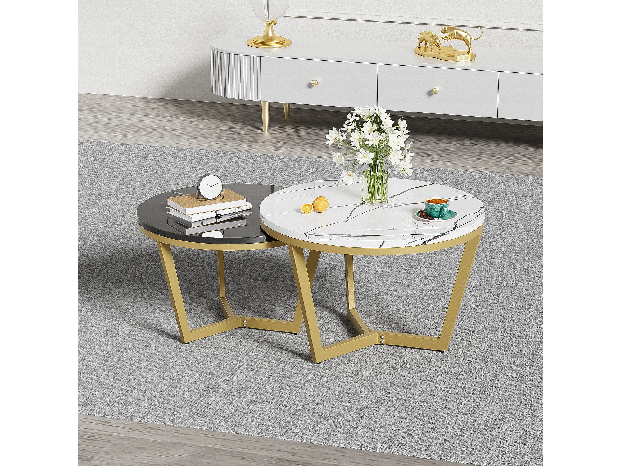 Lot de 2 tables basses gigognes - Motif de Marbre - bois MDF et métal doré - Blanc + noir