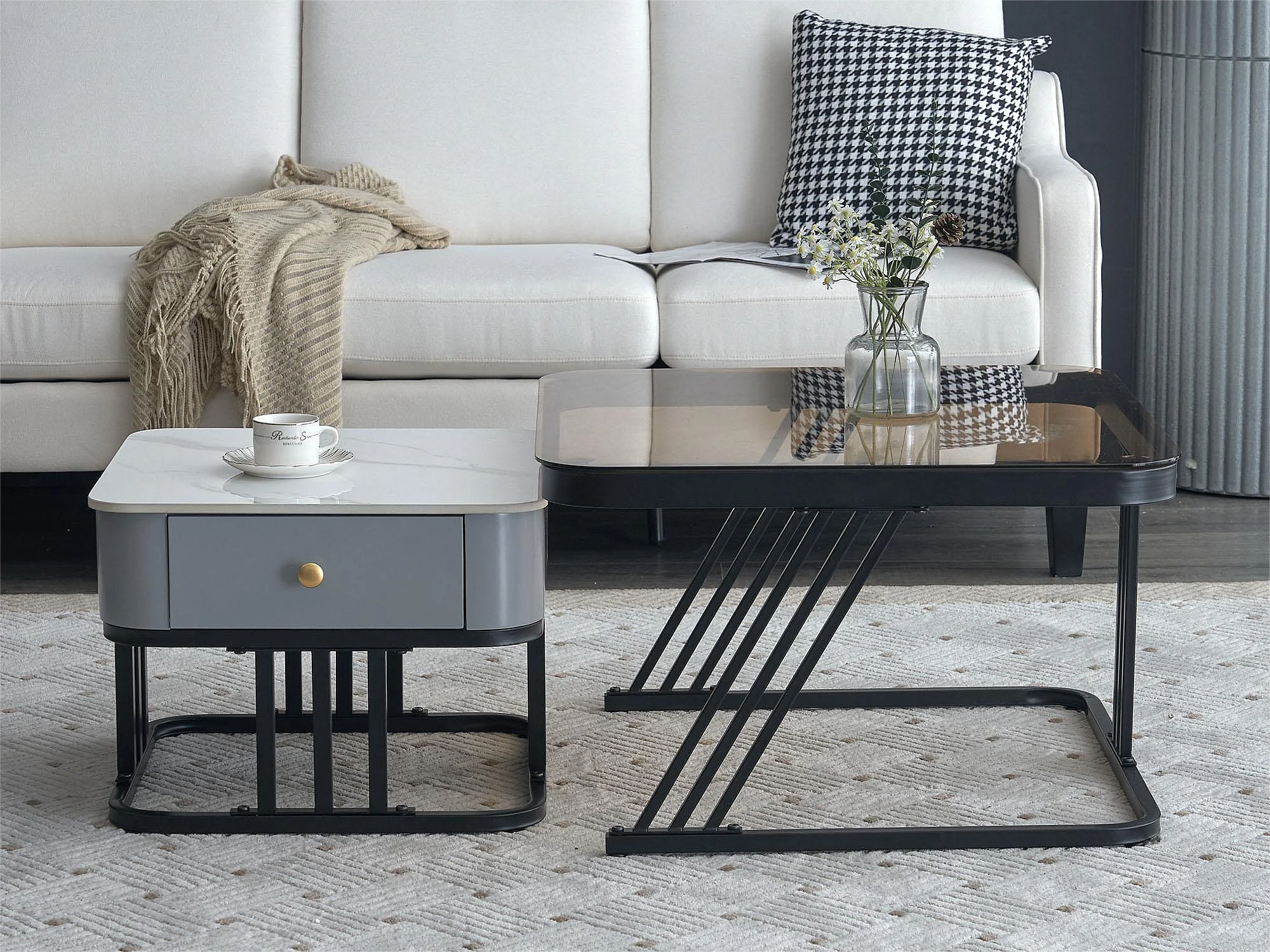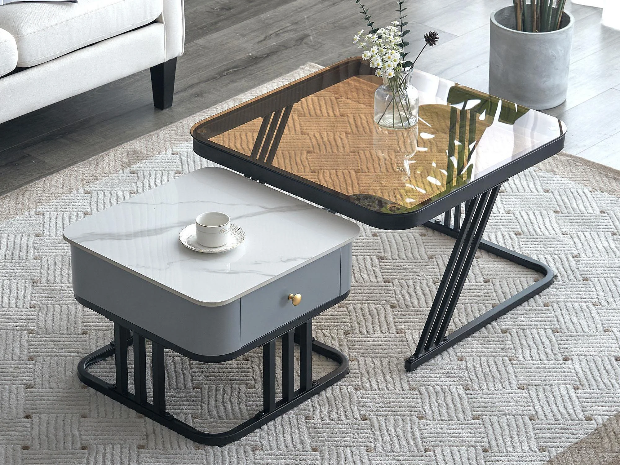 Lot de 2 tables basses gigognes - plateaux verre et motif marbre - blanc et marron