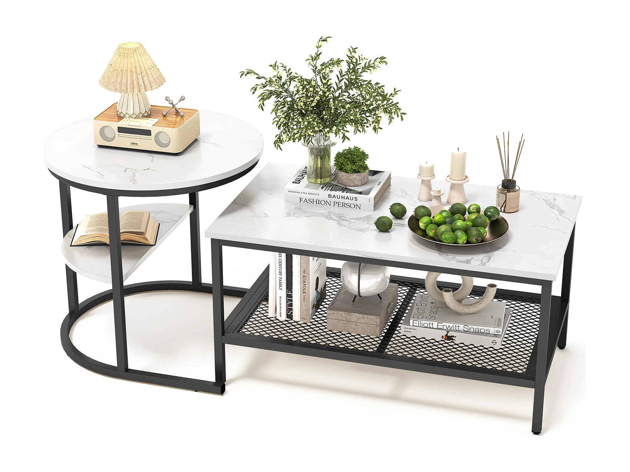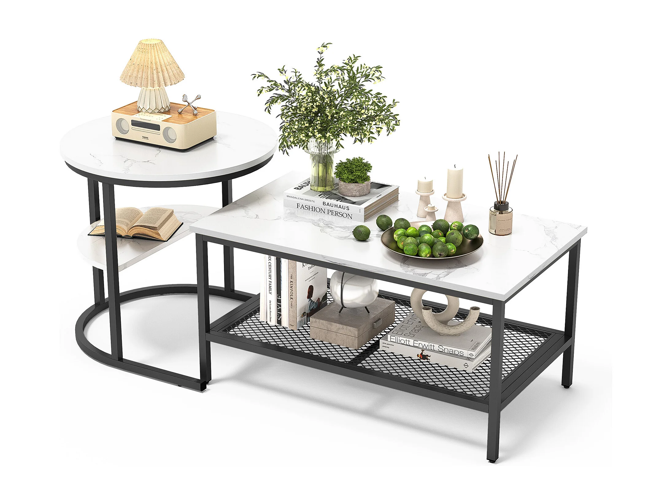 Lot de 2 Tables Basses Gigognes Scandinaves – Rectangulaire, Imprimé Marbre, Repose-pieds Réglables, Cadre Métal Noir