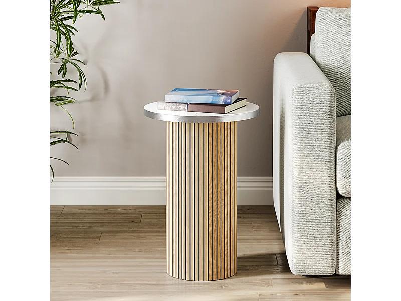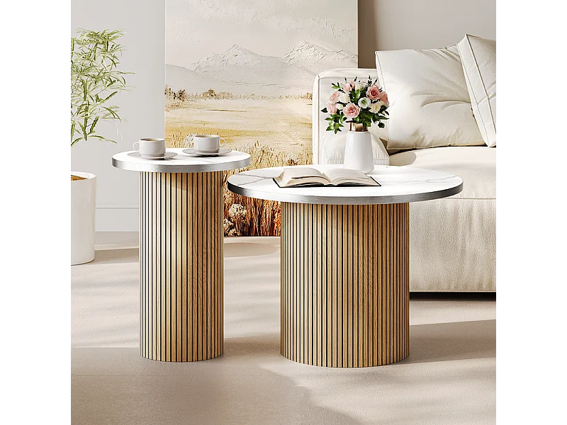 Lot de 2 Tables basses rondes - base de colonne romaine - placage marbre - Naturel clair