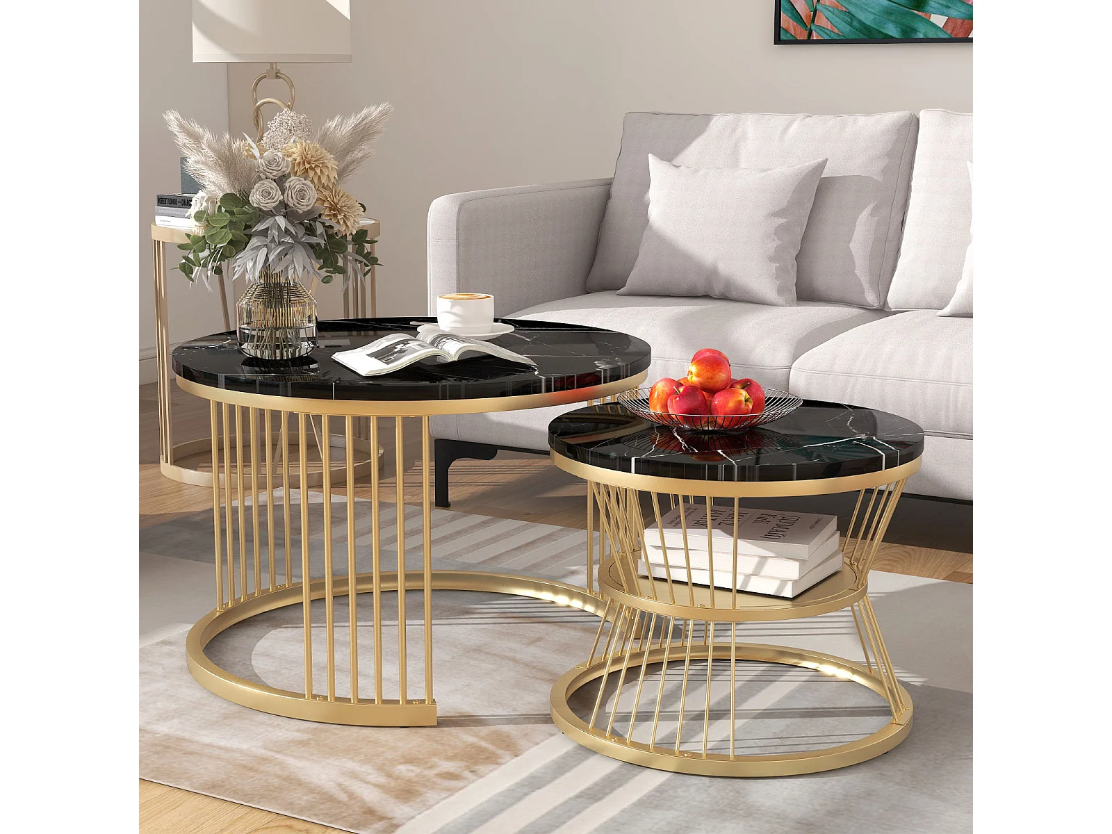 Lot de 2 Tables Basses Rondes, Modernes, avec marbré Brillant, pour salon, Salle de réception, Balcon et Bureau, Structure en métal, Forme Unique