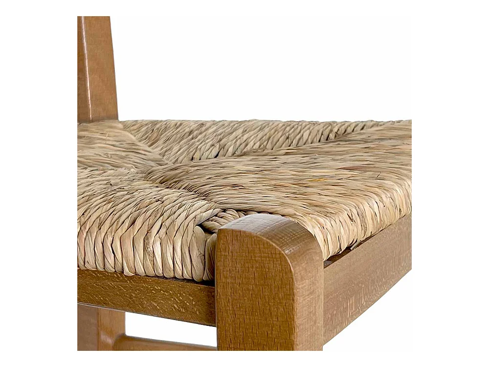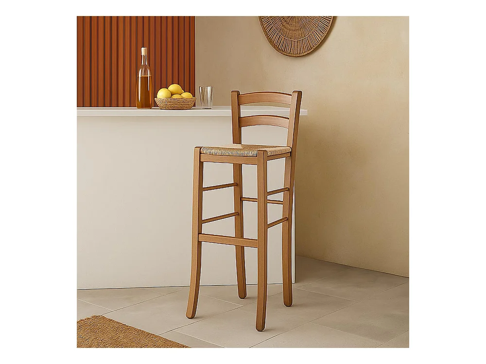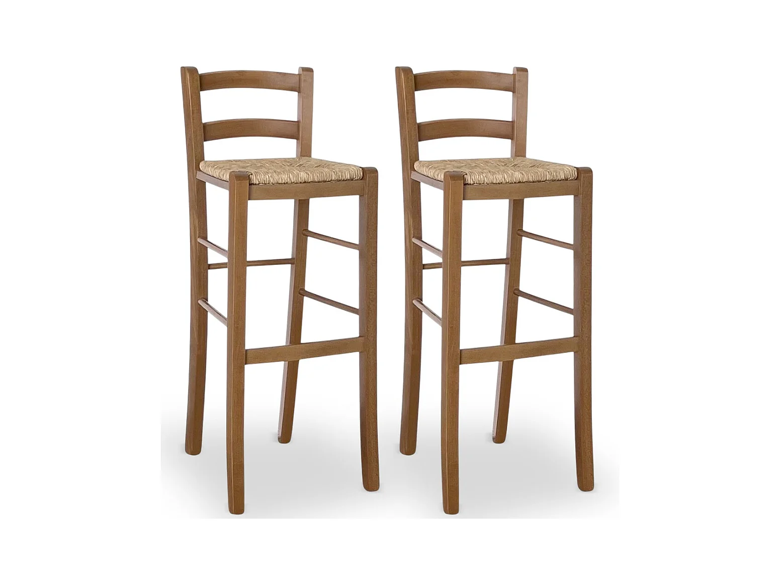 Lot de 2 tabourets de bar de 80 cm de haut en bois de noyer clair avec dossier et assise en paille.