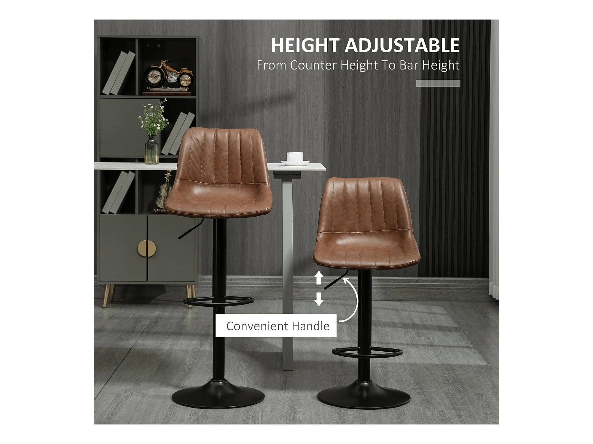 Lot de 2 tabourets de bar réglables en hauteur, similicuir, tabouret de bistrot avec repose-pieds, acier, marron