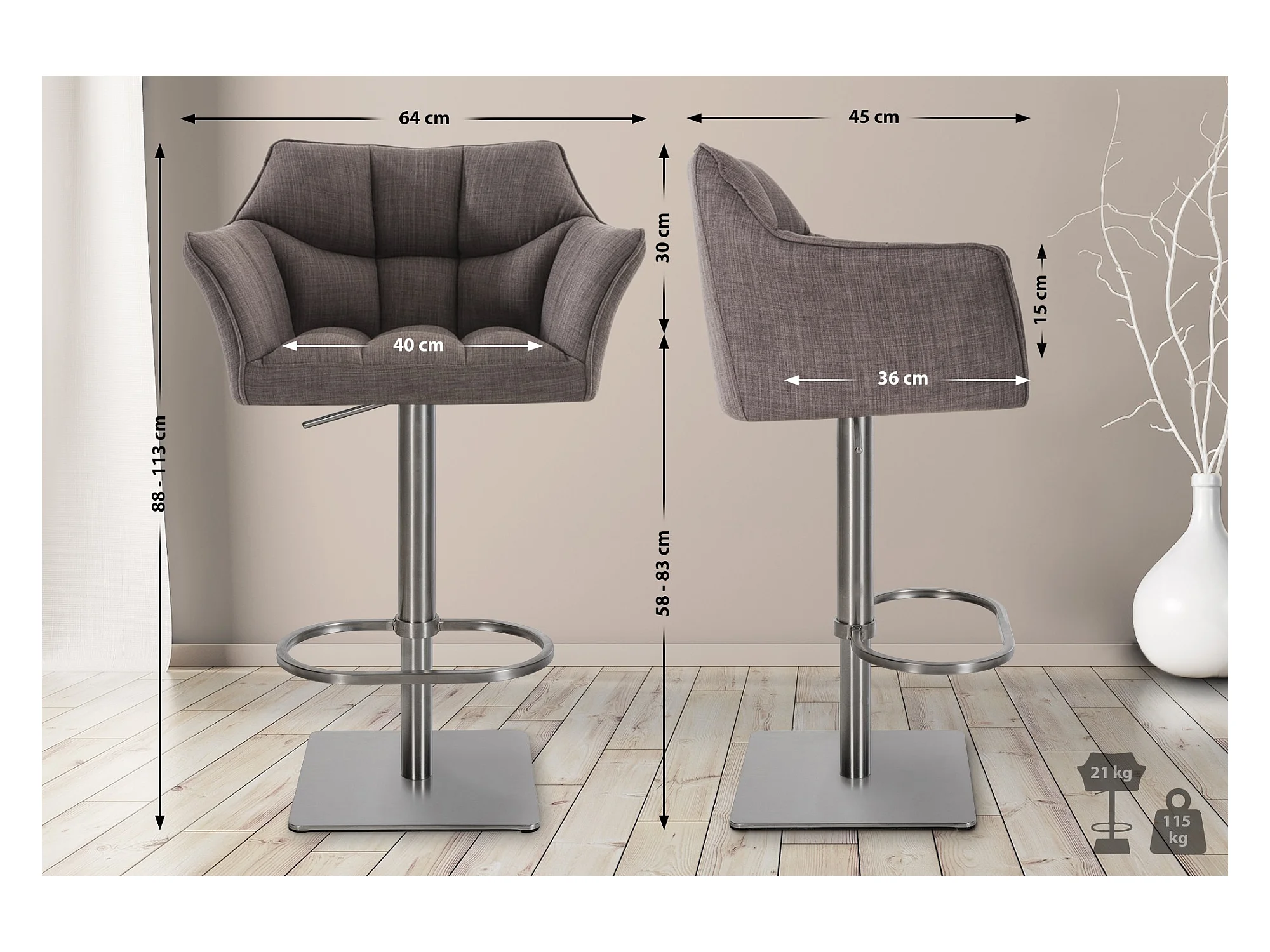 Lot de 2 Tabouret de bar - Tissu & Acier inoxydable - Gris - Damaso