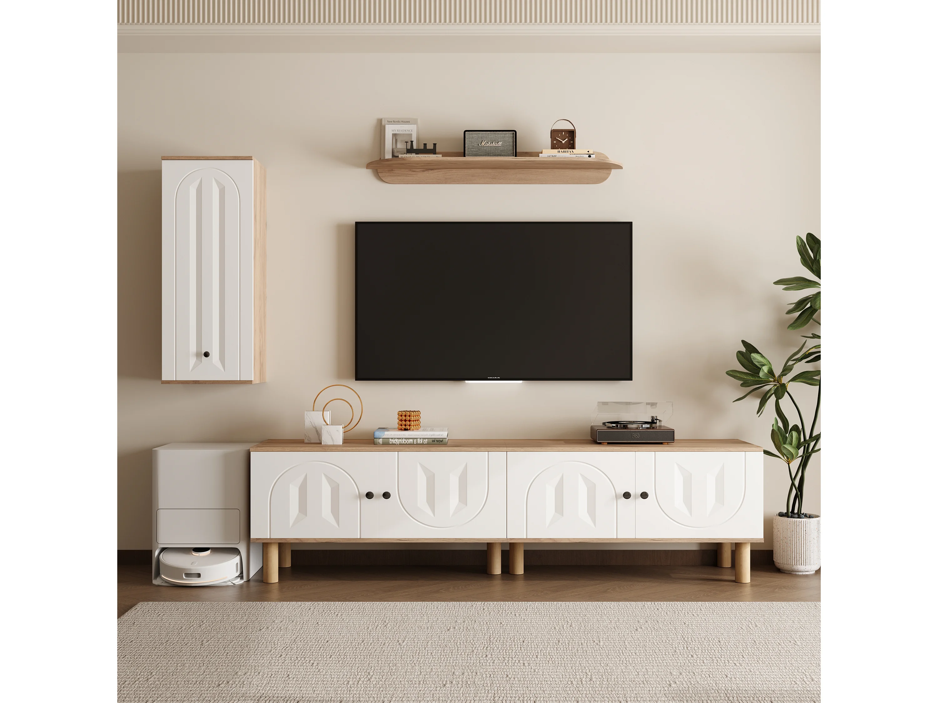 Lot de 3 meuble mural - buffet haut + meuble tv + étagère murale - aggloméré - naturel + blanc