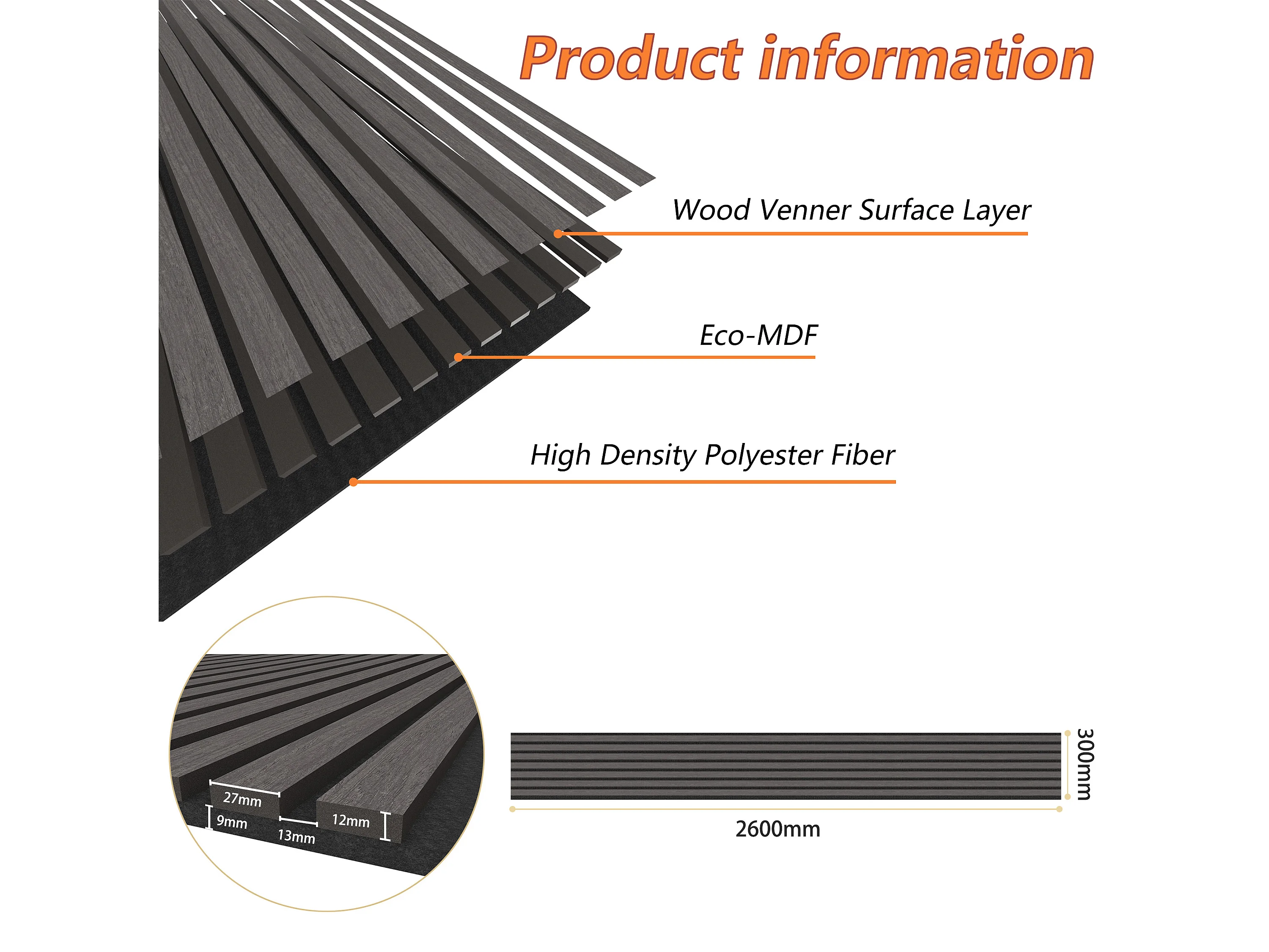 Lot de 3 Panneaux Muraux Décoratifs Acoustiques Bois MDF 260x30cm Chêne noir AntiBruit, Facile à Poser