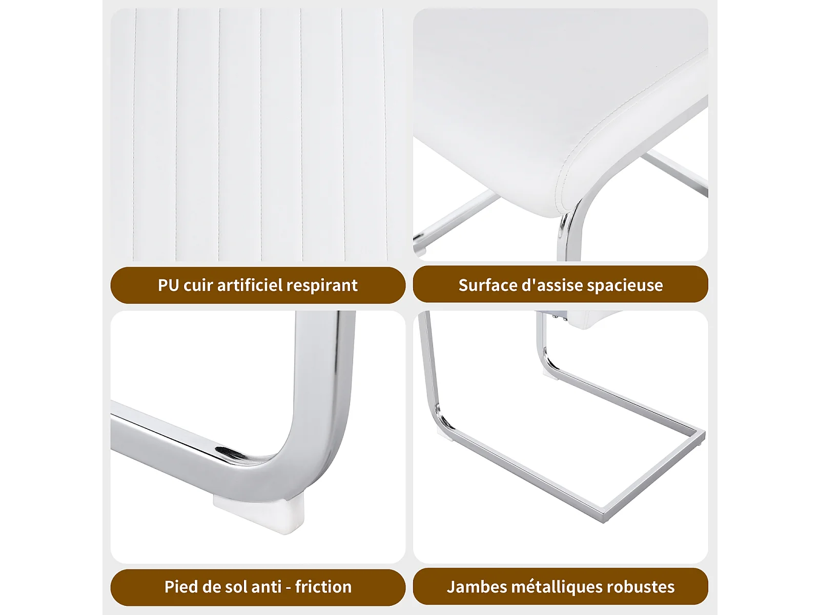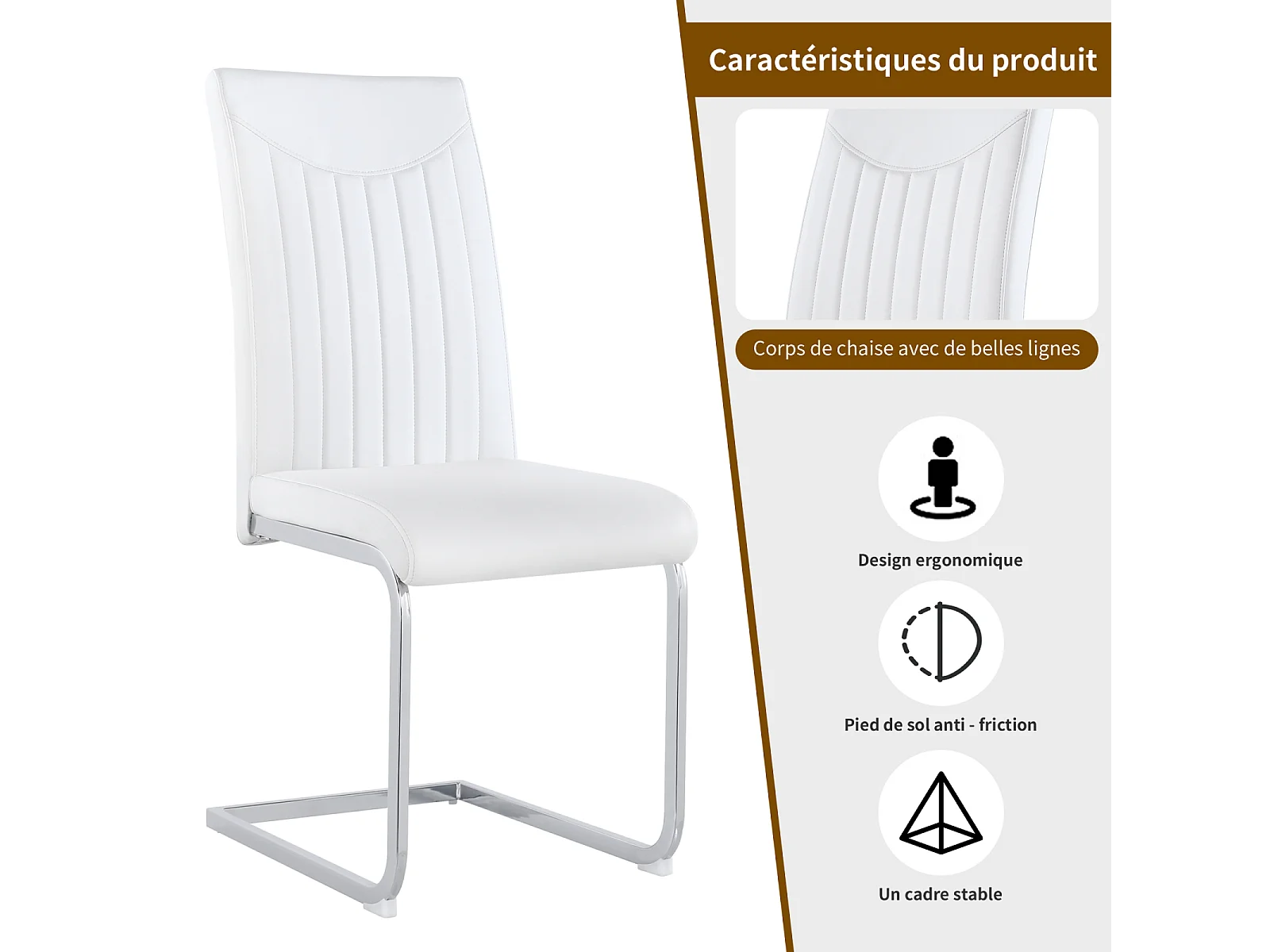 Lot de 4 chaise de piétement luge, structure en métal chromé, charge max 150 kg, tissu en cuir artificiel PU, 41x41x90cm, blanc