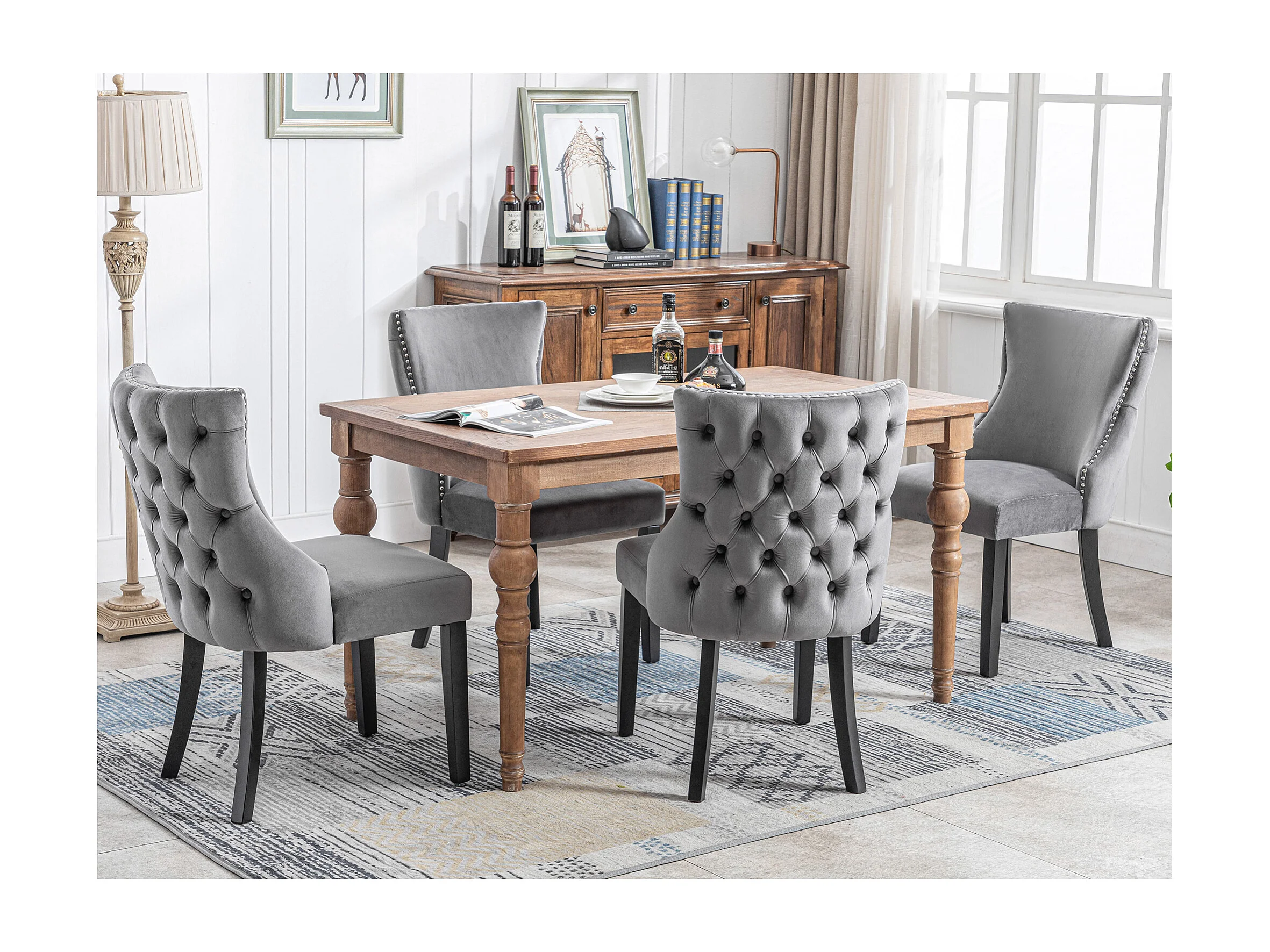 Lot de 4 chaises de salle à manger, assise et dossier rembourrés, anneau de préhension, pieds en bois, velours gris