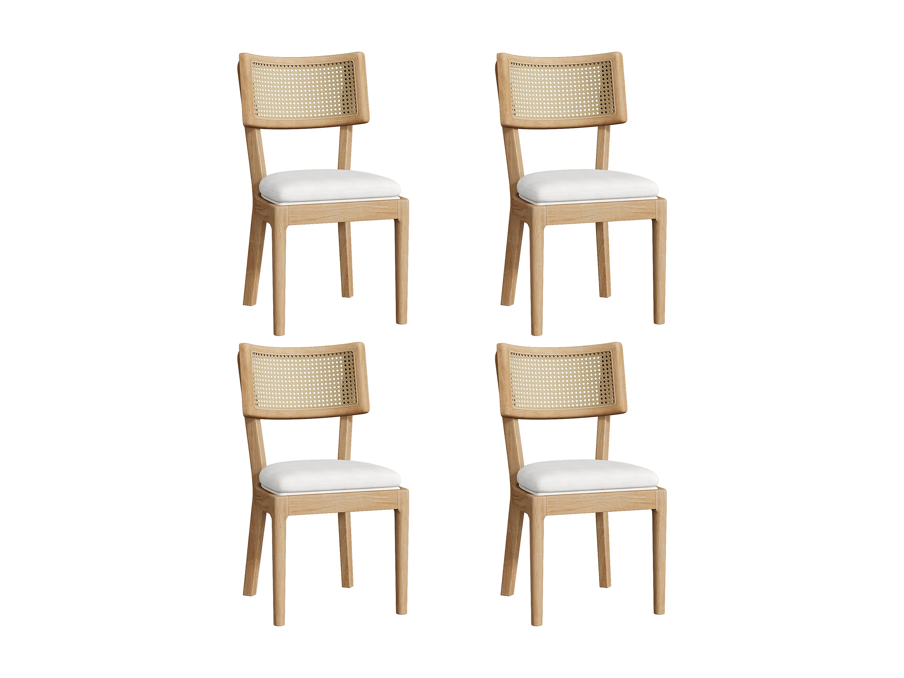 Lot de 4 chaises de salle à manger - Dossier en rotin - coussin de siège en lin - Bois massif - Naturel