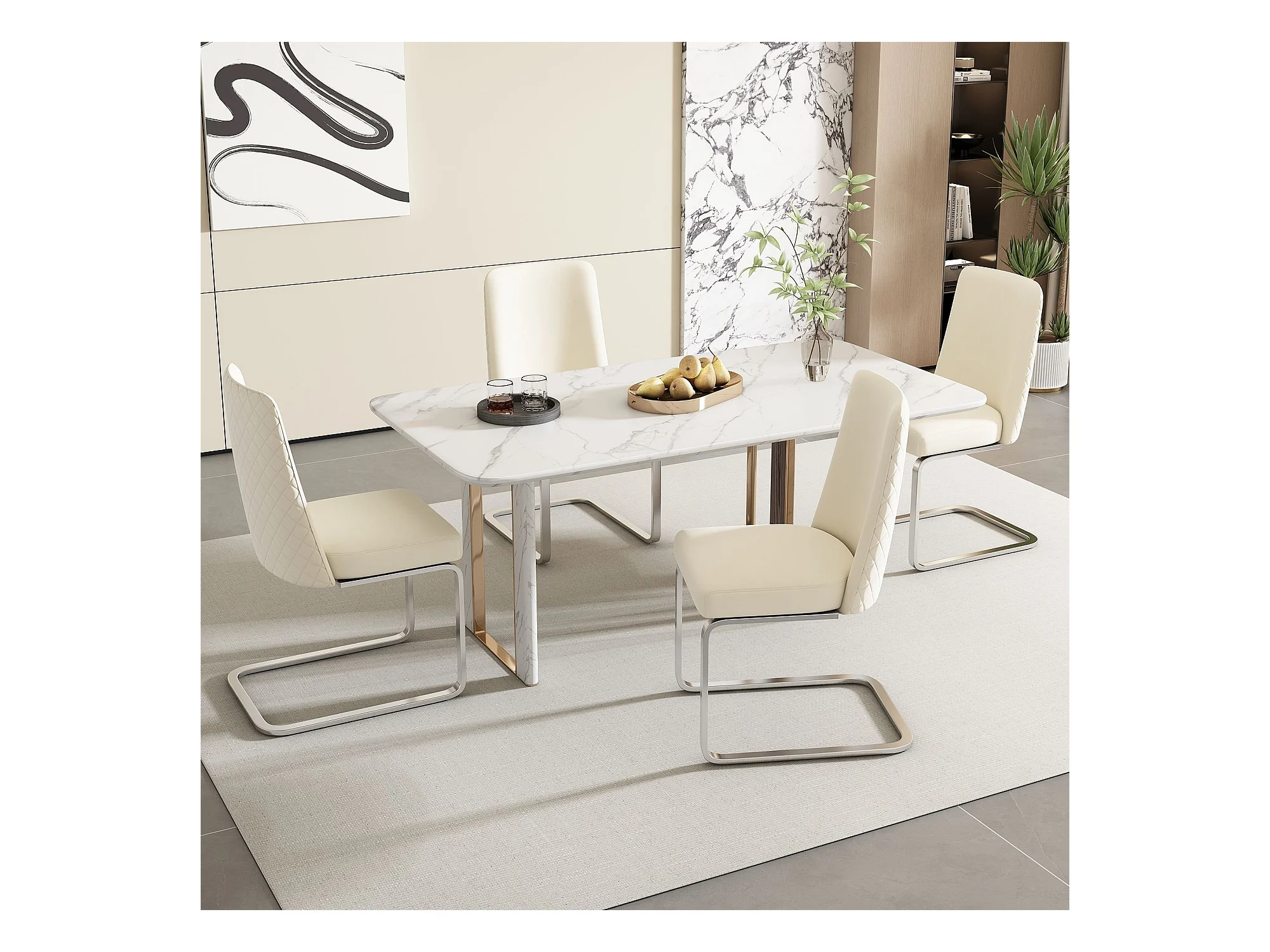 Lot de 4 chaises de salle à manger, velours beige, avec dossier matelassé, pieds argentés - design moderne