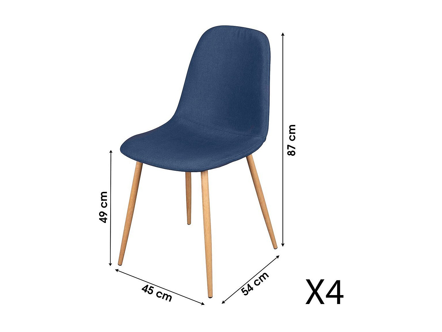 Lot de 4 chaises en tissu bleu avec pieds en métal effet bois – 45x87x54 cm, hauteur d'assise 49 cm – Collection NORDICA