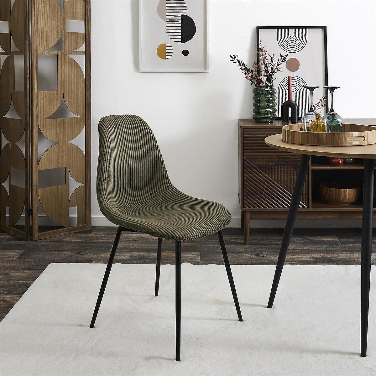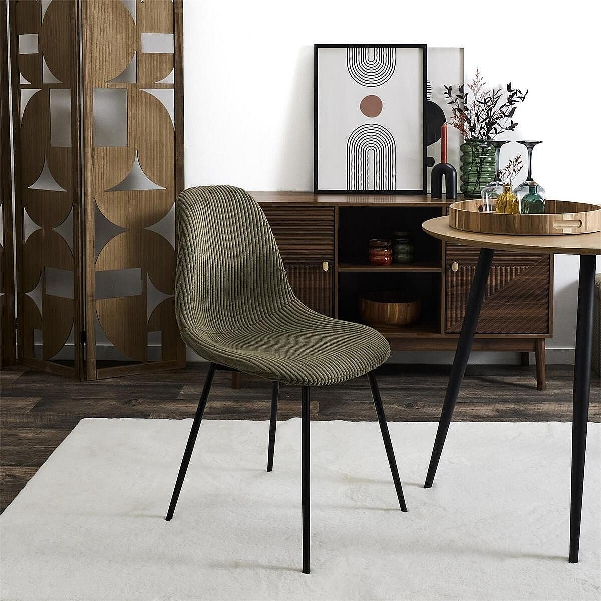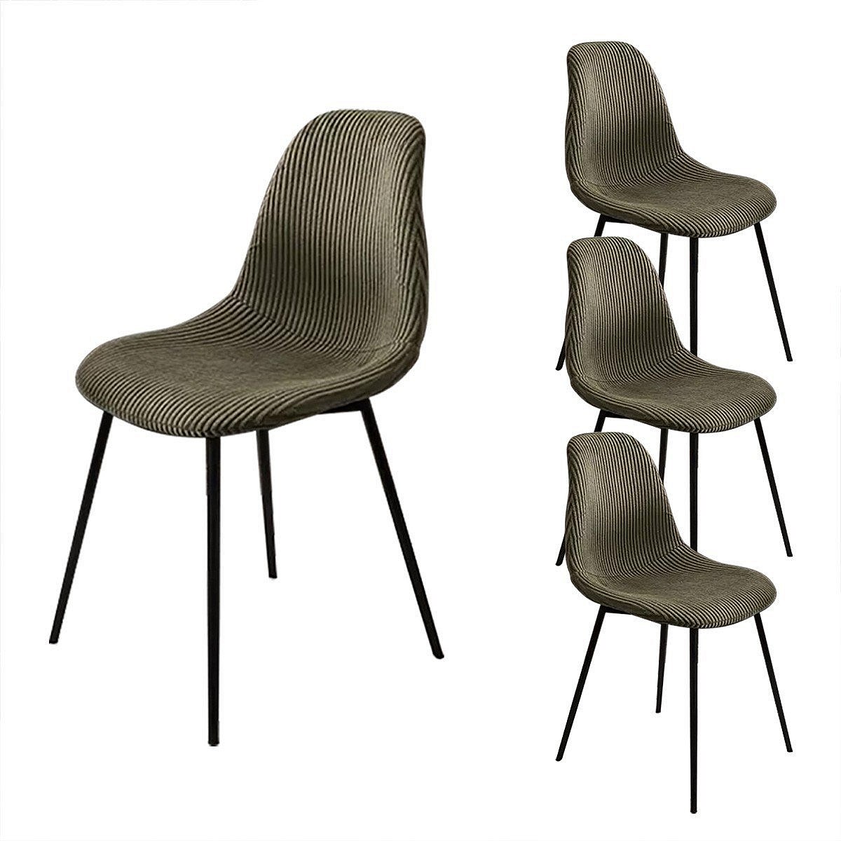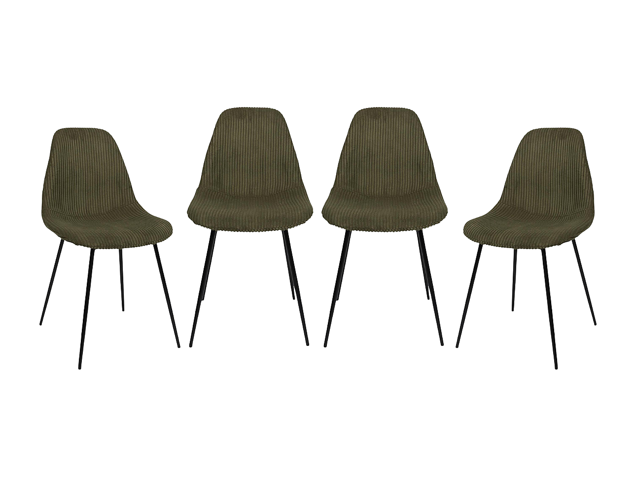 • Lot de 4 chaises avec assise et dossier en velours côtelé et pieds en métal noir.