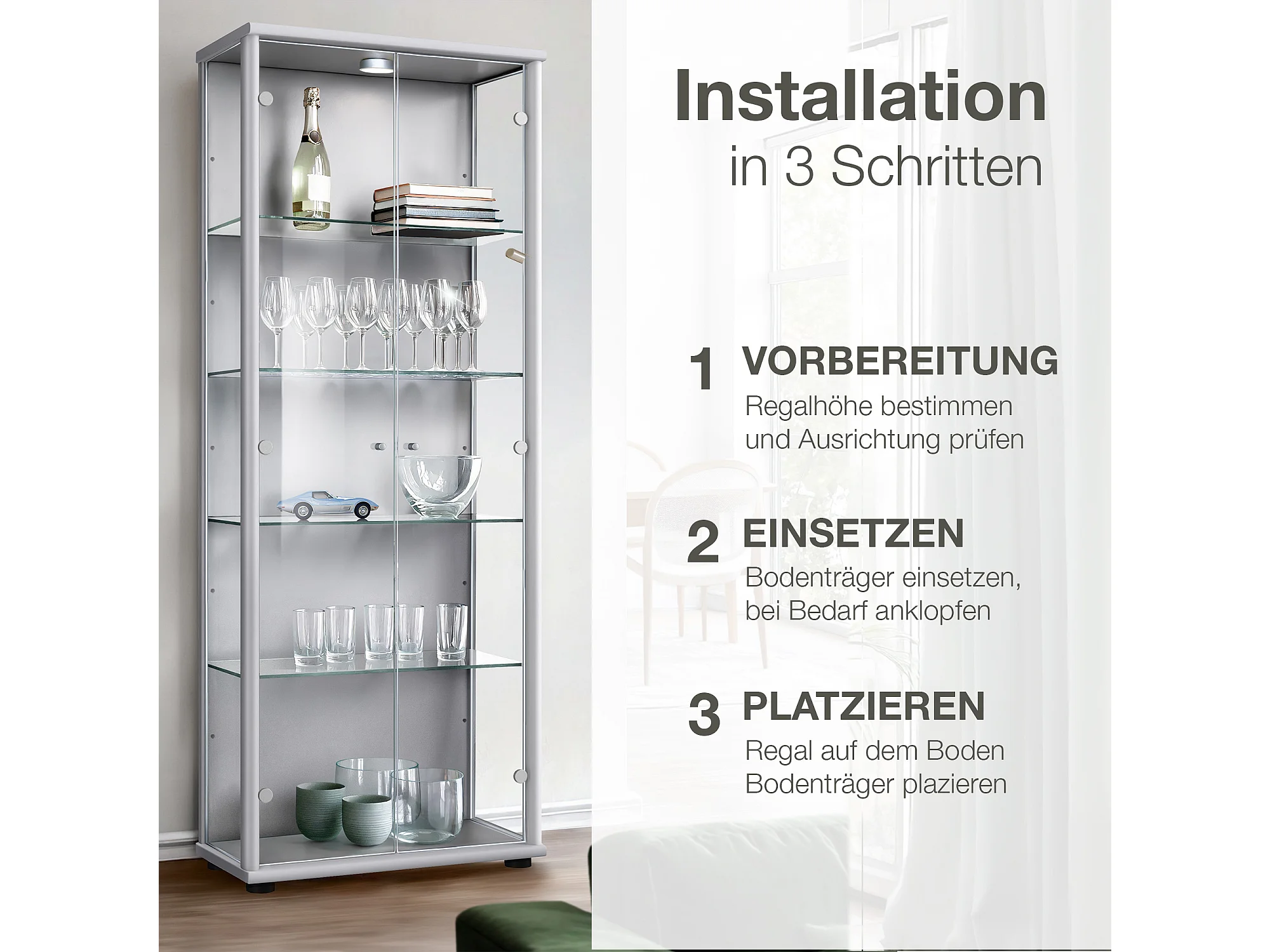Vitrine sur pied avec 1 porte, 4 étagères en verre réglables en hauteur, miroir & serrure - Avec éclairage LED - 176x37x33 cm - Couleur argentée