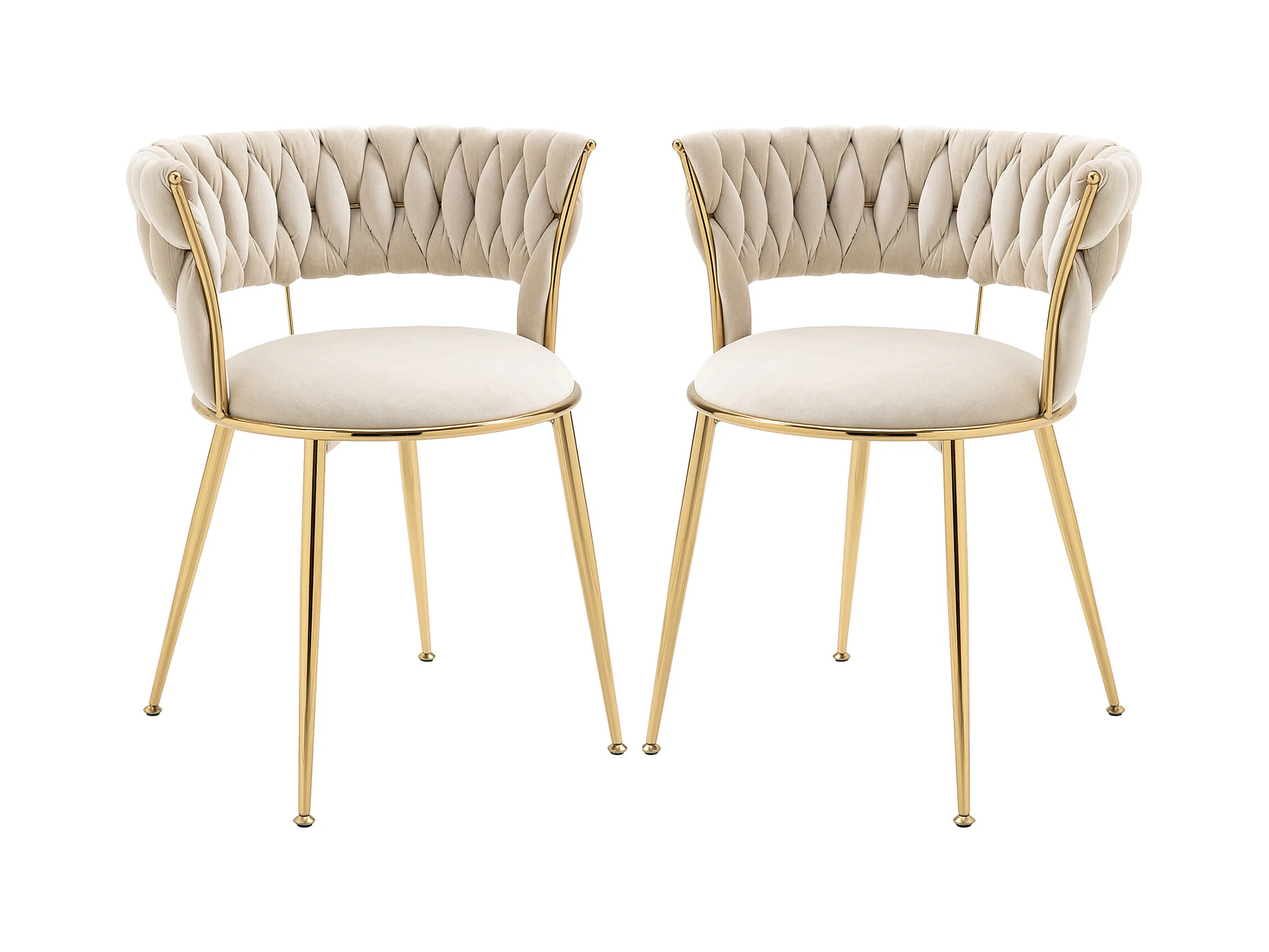 Lot de 2 chaises de salle à manger avec dossier tressé et pieds en métal doré - velours ivoire