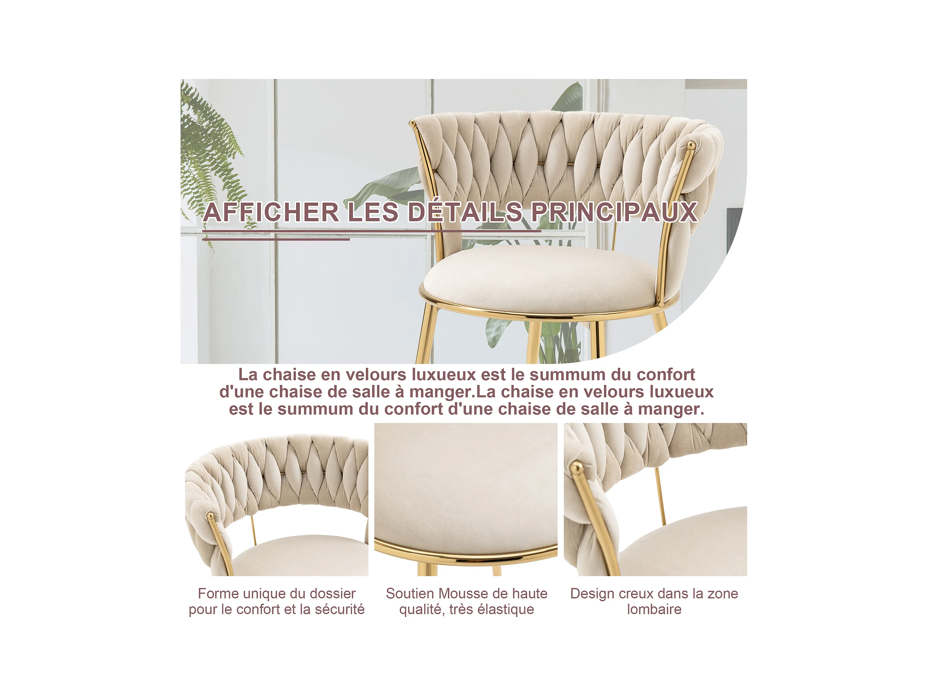 Lot de 6 chaises en velours ivoire - dossier ajouré tressé et pieds dorés - Idéales pour intérieur chic et contemporain