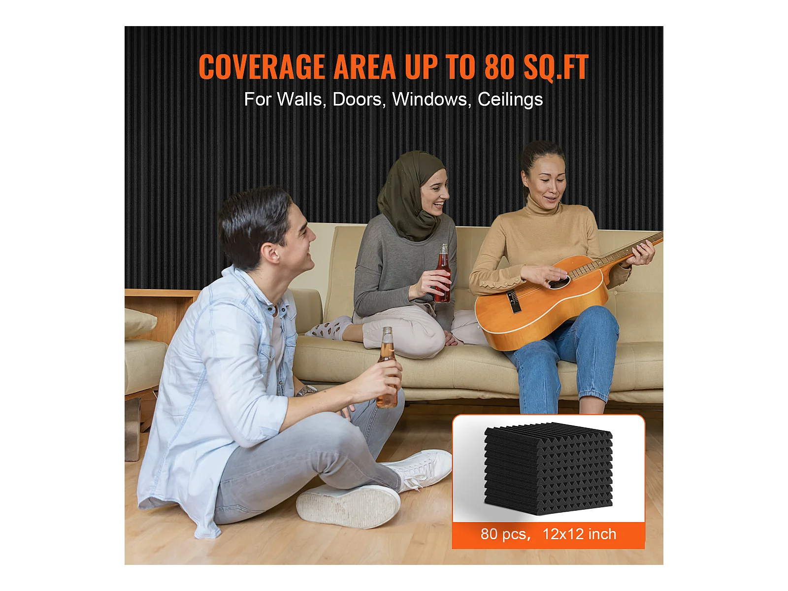 Lot de 80 Panneaux en Mousse Acoustique SucceBuy, 30.48 x 30.48 x 2.54 cm, pour Murs Plafonds de Studio, Maison, Bureau, Noir