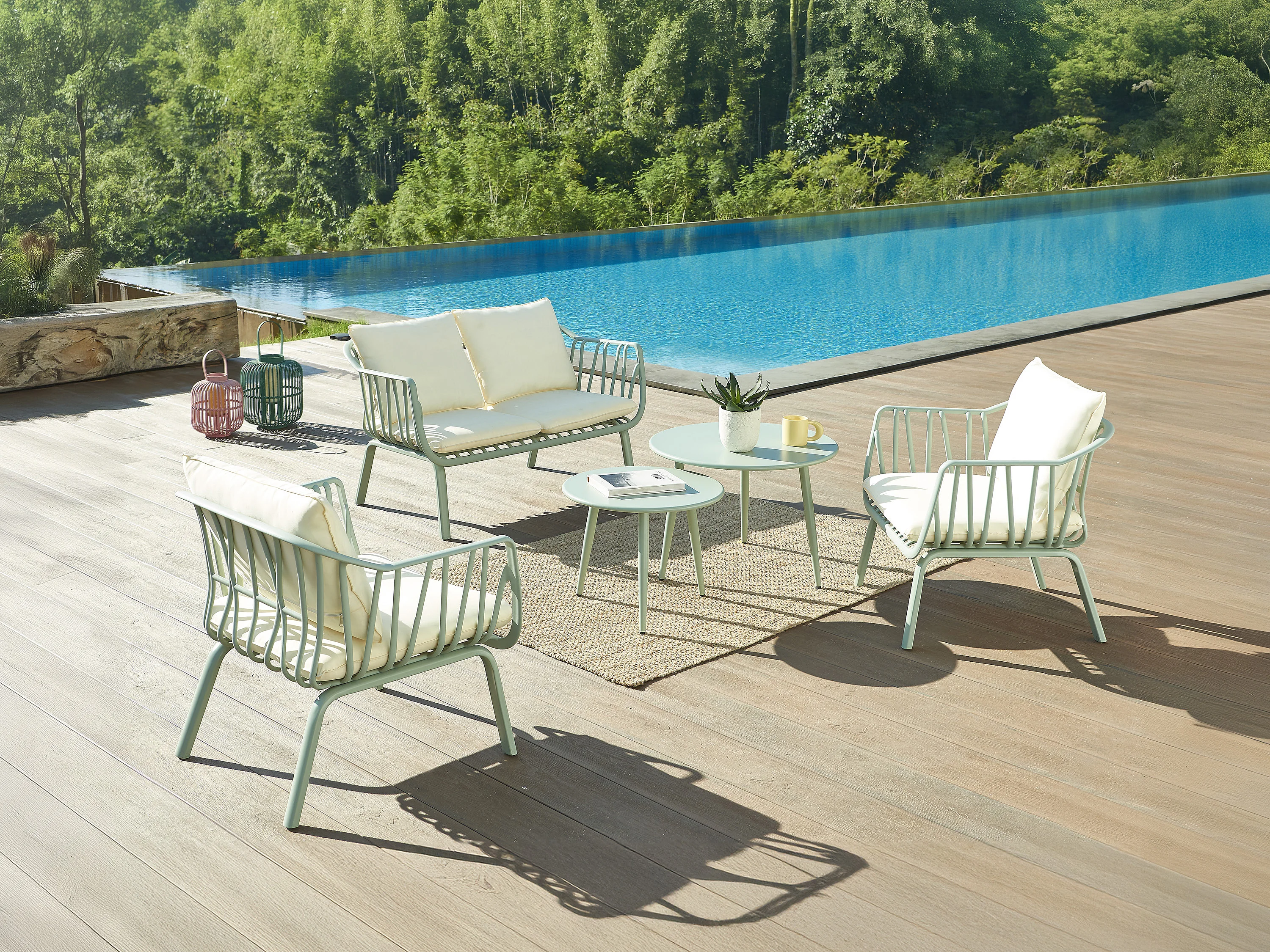 Salon de jardin en polypropylène et métal : un canapé 2 places, 2 fauteuils et 2 tables basses - Vert amande - LOYNA de MYLIA
