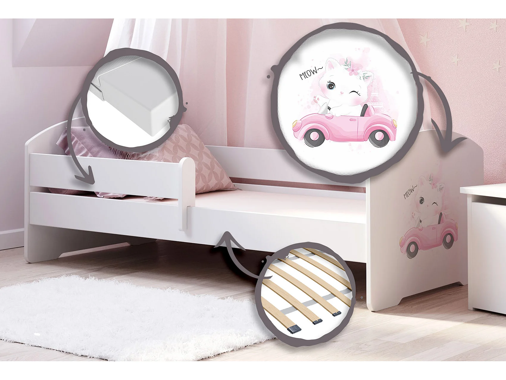 Luk - lit simple 160x80 avec graphisme pour enfants, dans un ensemble avec garde-corps, matelas et cadre