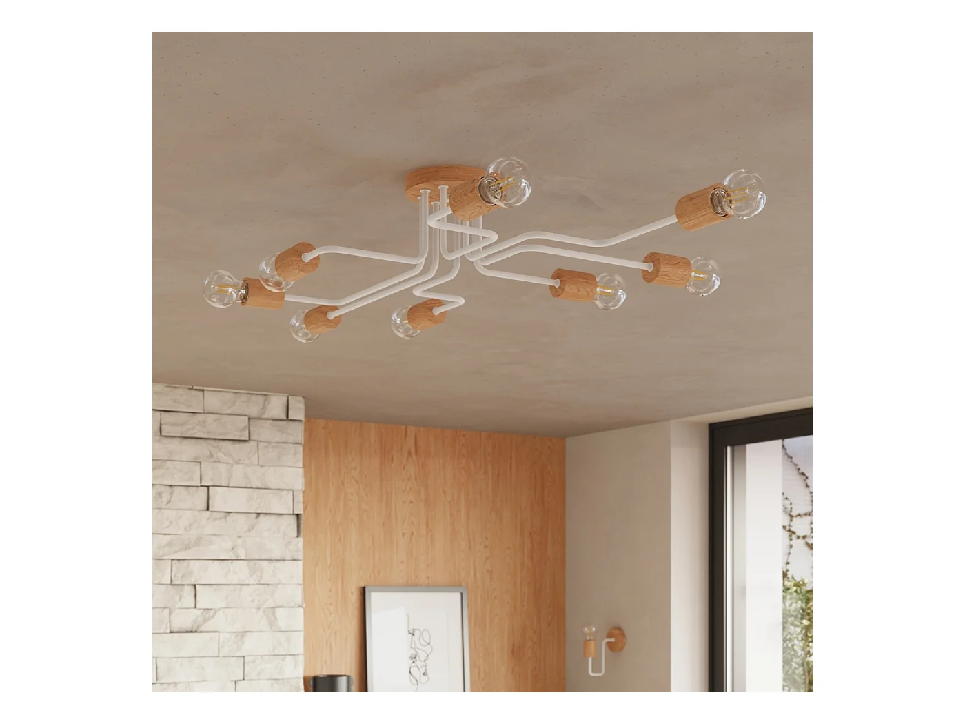 Lustre Zimbo grenier en acier/bois - 8 sources lumineuses 4000K - L.100 x H.16,5 cm - blanc/bois naturel