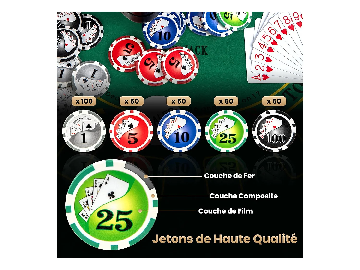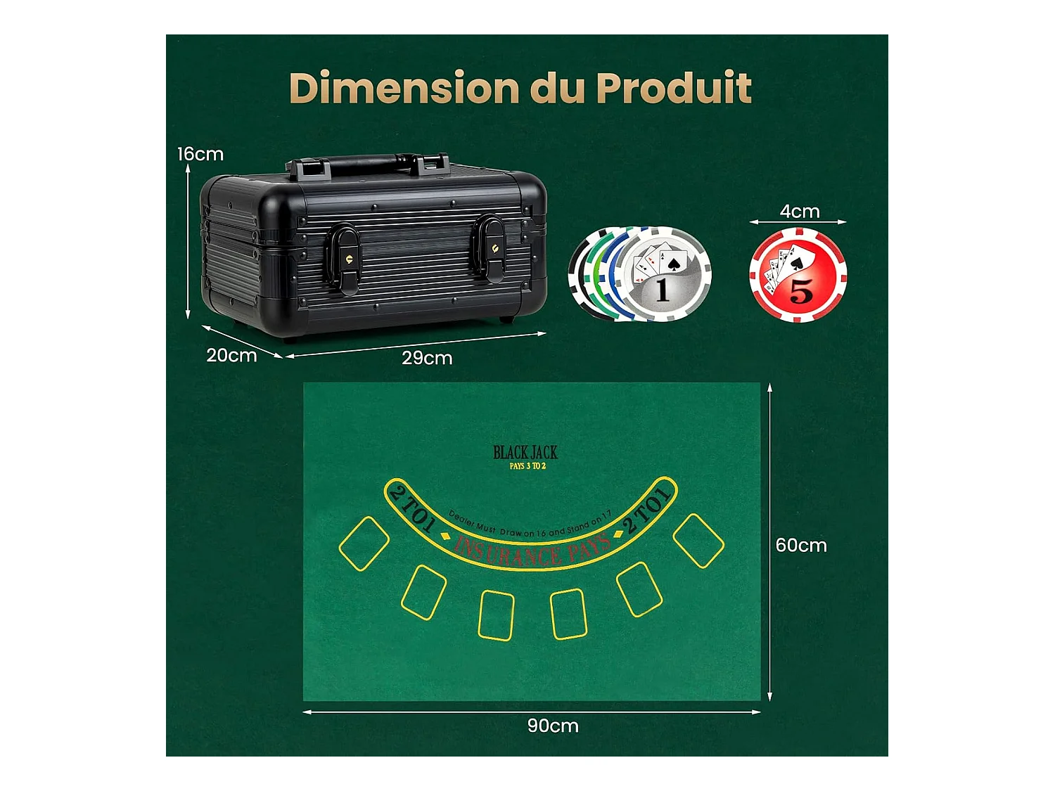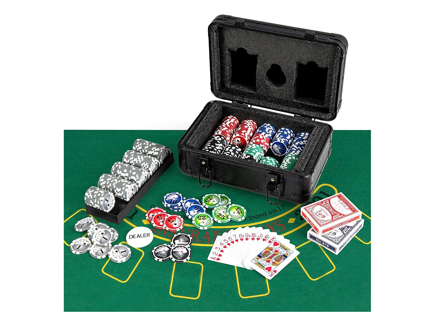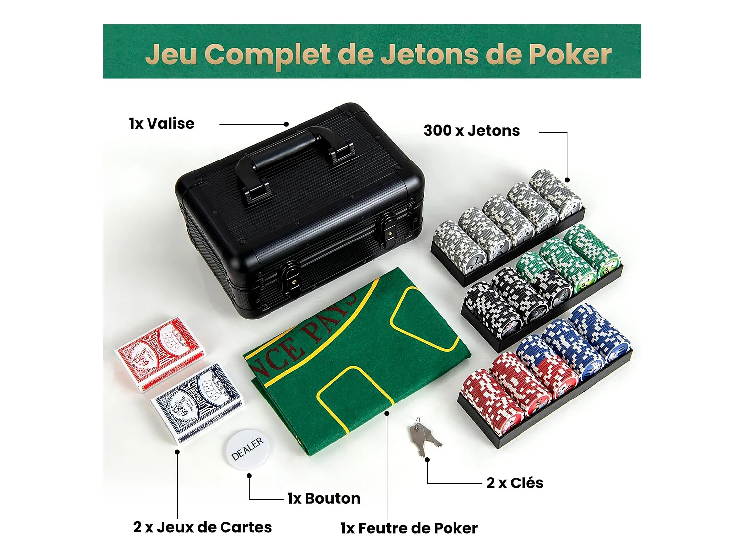 Mallette de Poker en Aluminium avec 300 Jetons & 2 Jeux de Cartes, Coffret de Poker Verrouillable avec 1 Dealer & Tapis en Feutre & 2 Clés pour Casino Fête Voyage