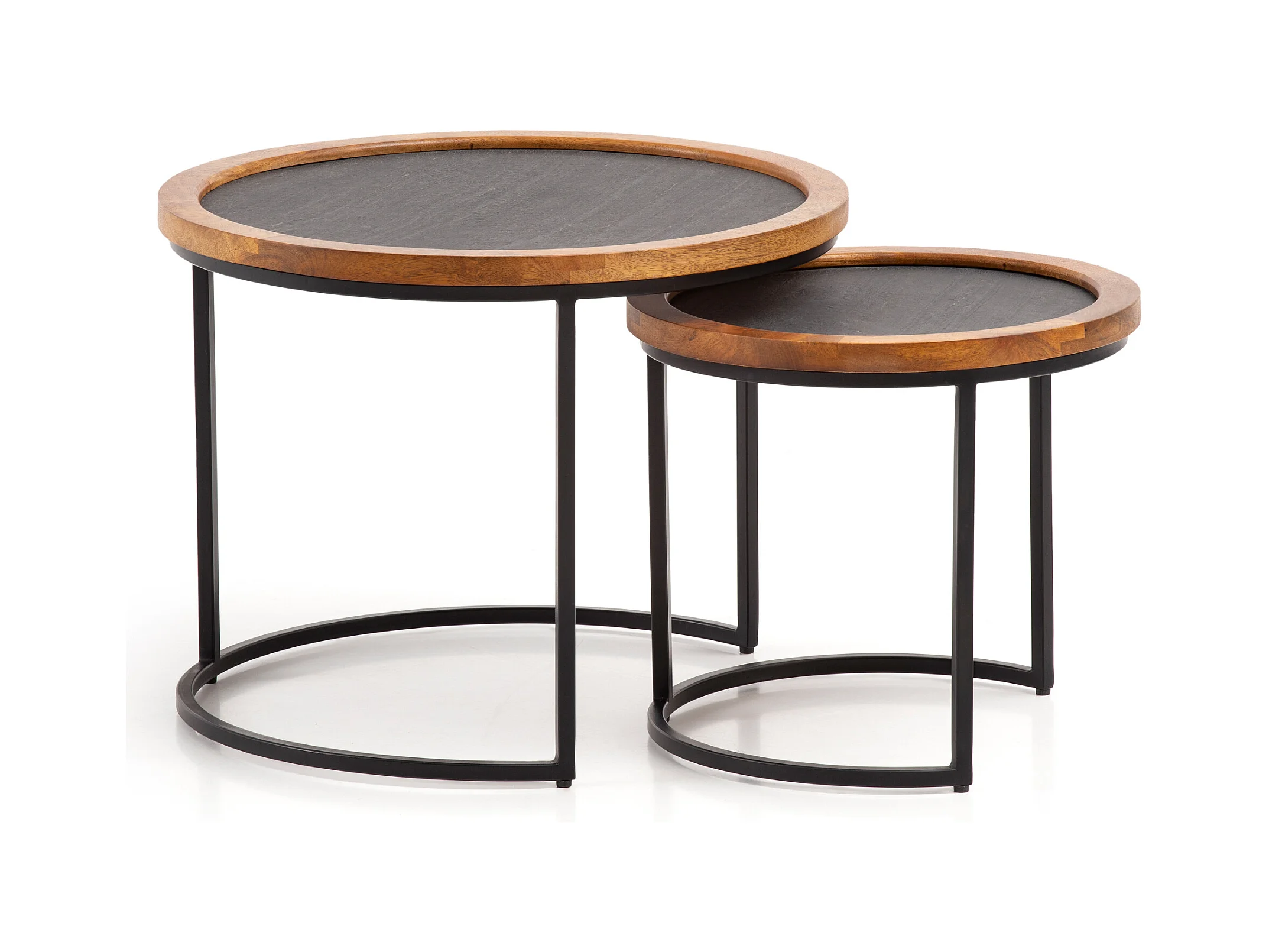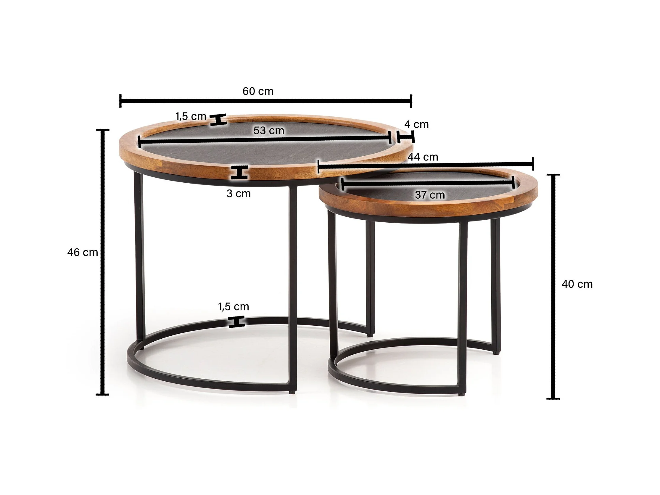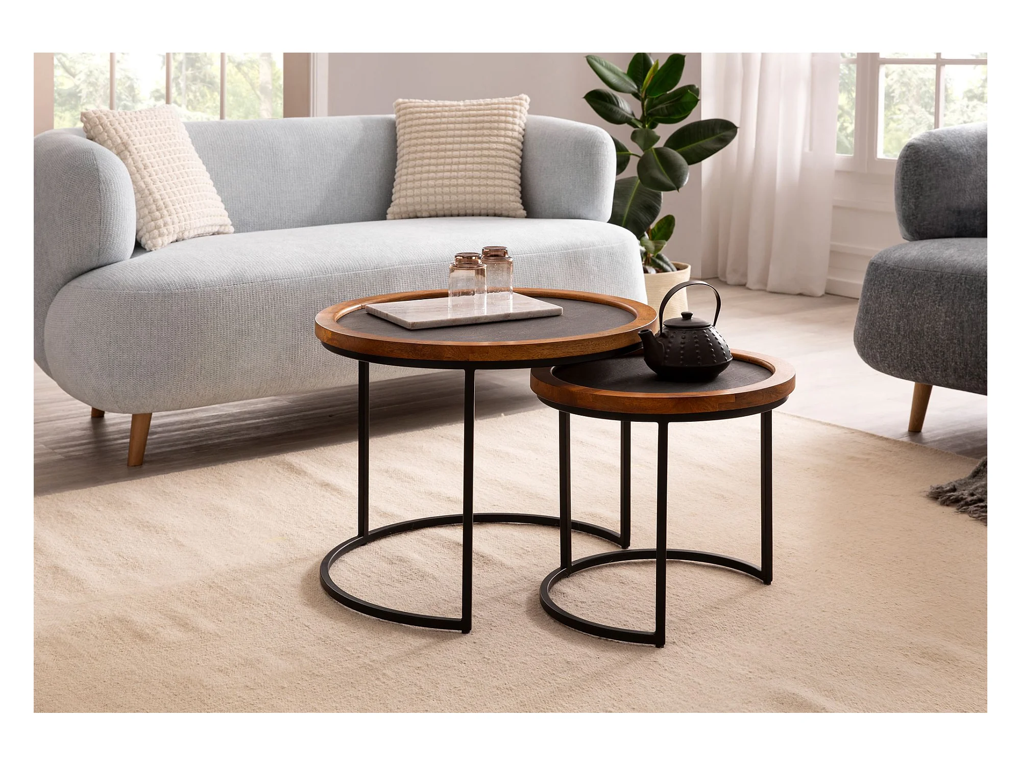 Salontafel set van 2 salontafel in massief hout / industrieel rond metaal | Bijzettafel met zwarte metalen poten | 2-delige houten bijzettafel