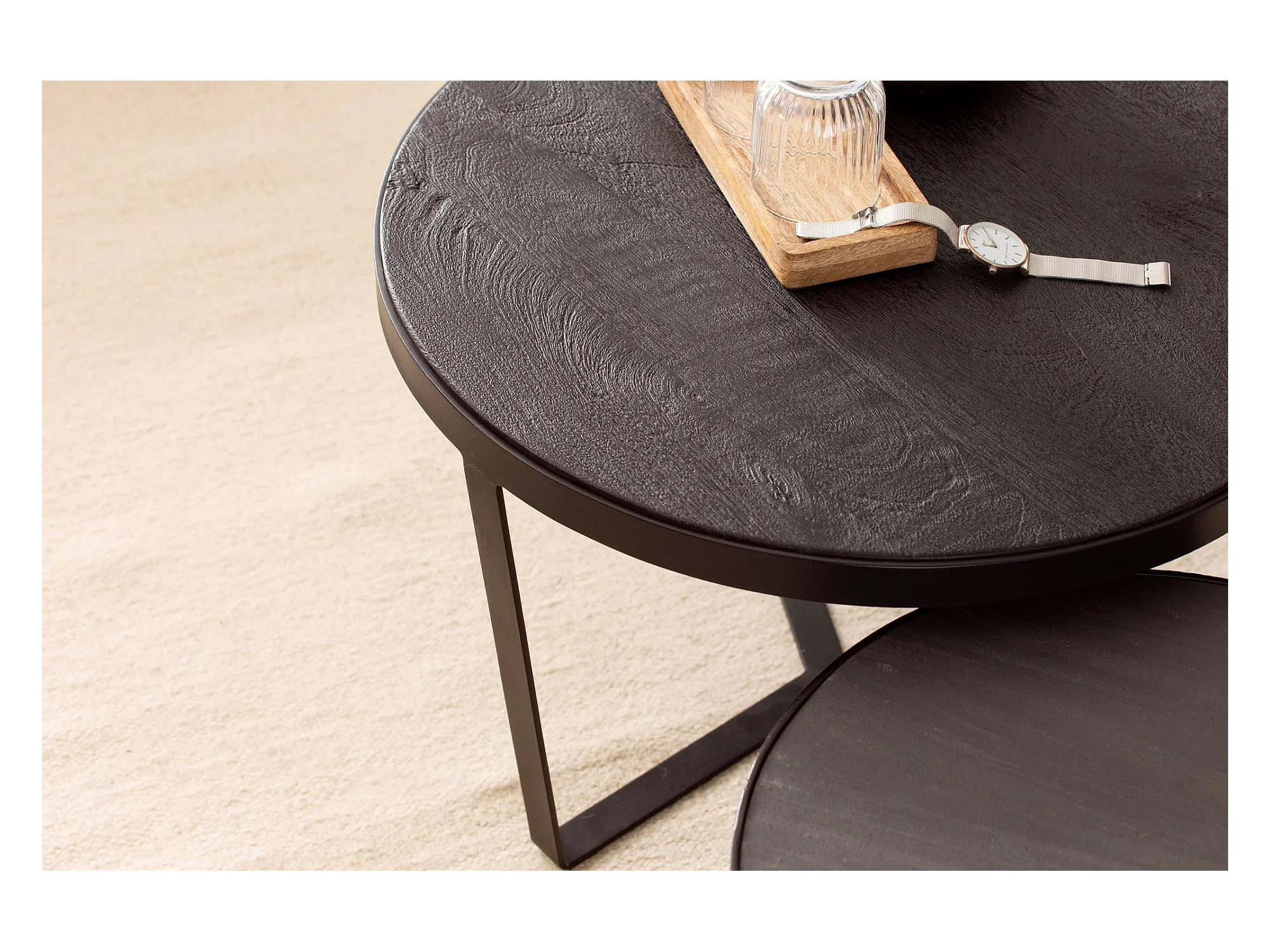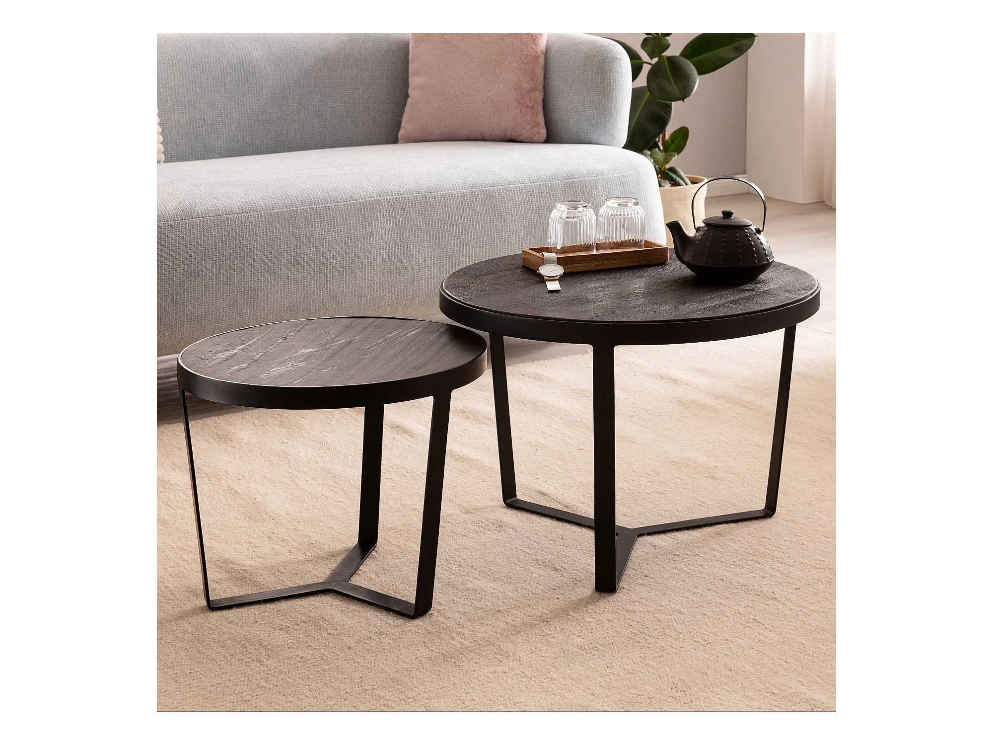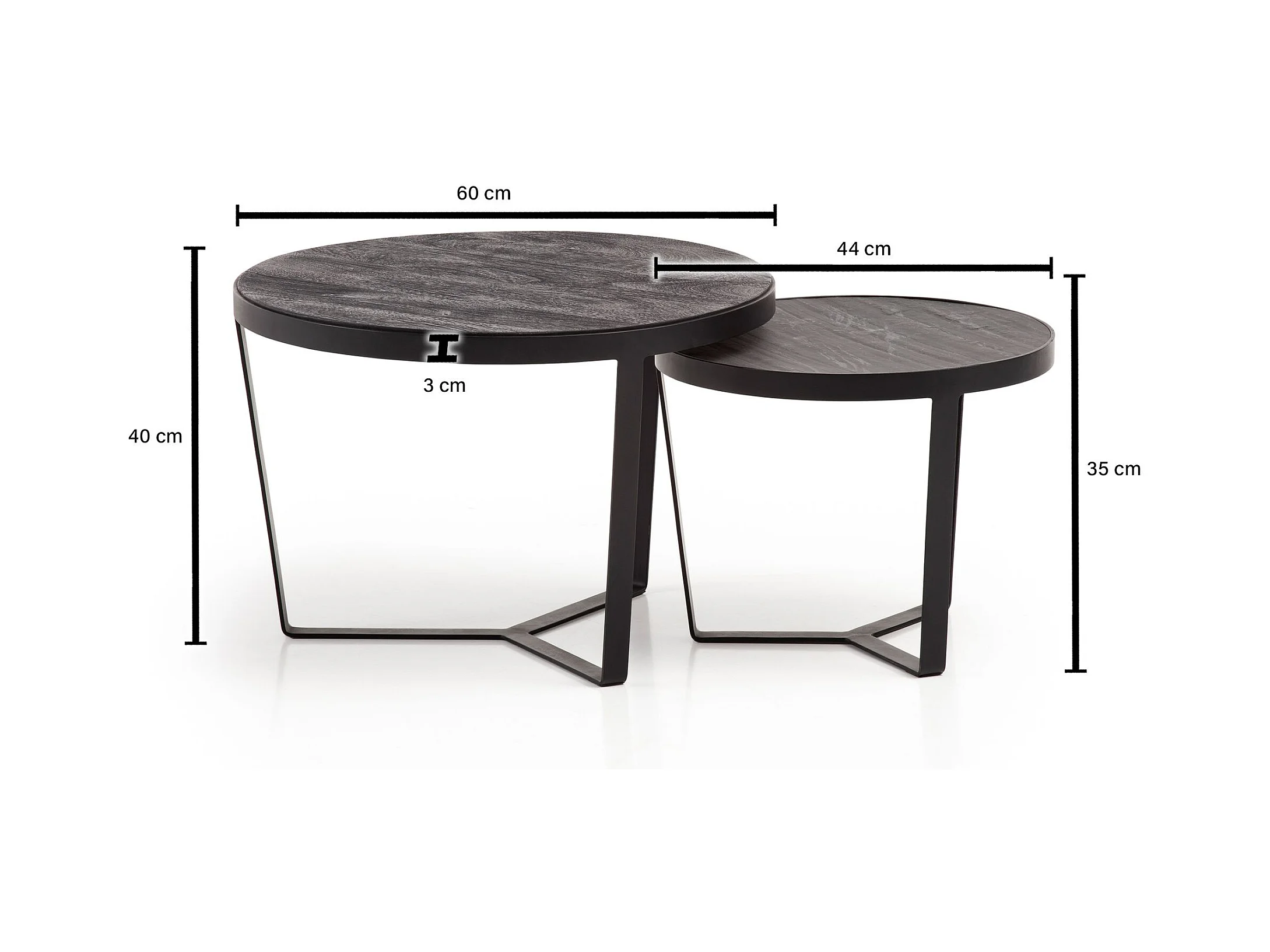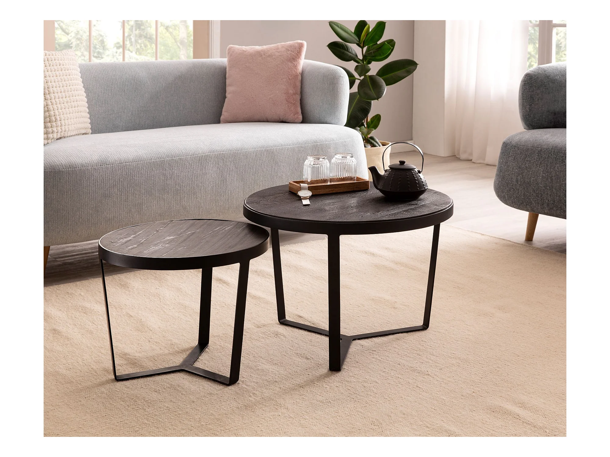 Salontafel set van 2 salontafel in massief hout / industrieel rond metaal | Bijzettafel met zwarte metalen poten | 2-delige houten bijzettafel
