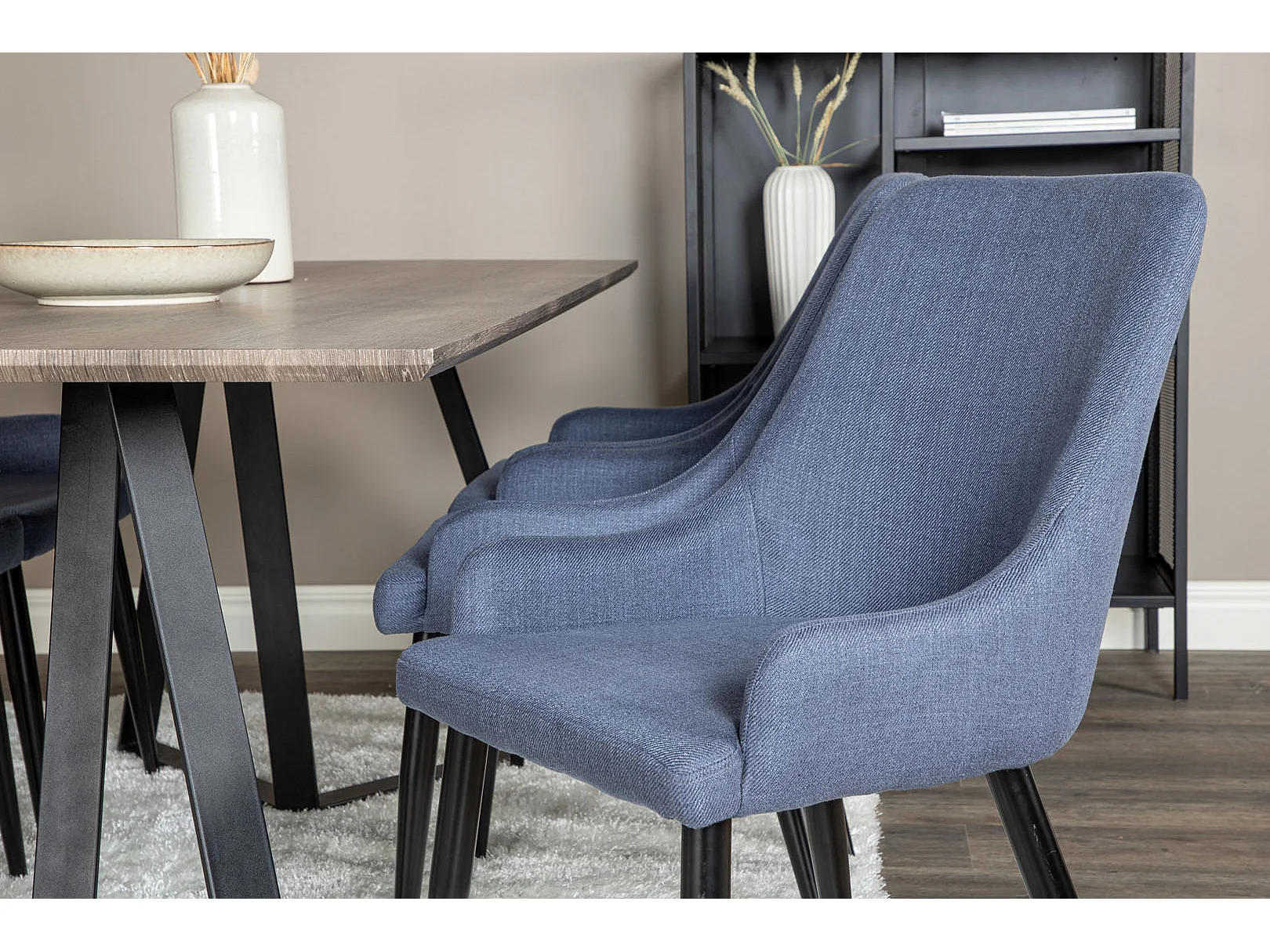 MarinaGRBL ensemble table, table El bois décor gris et 6 Plaza chaises bleu, noir.